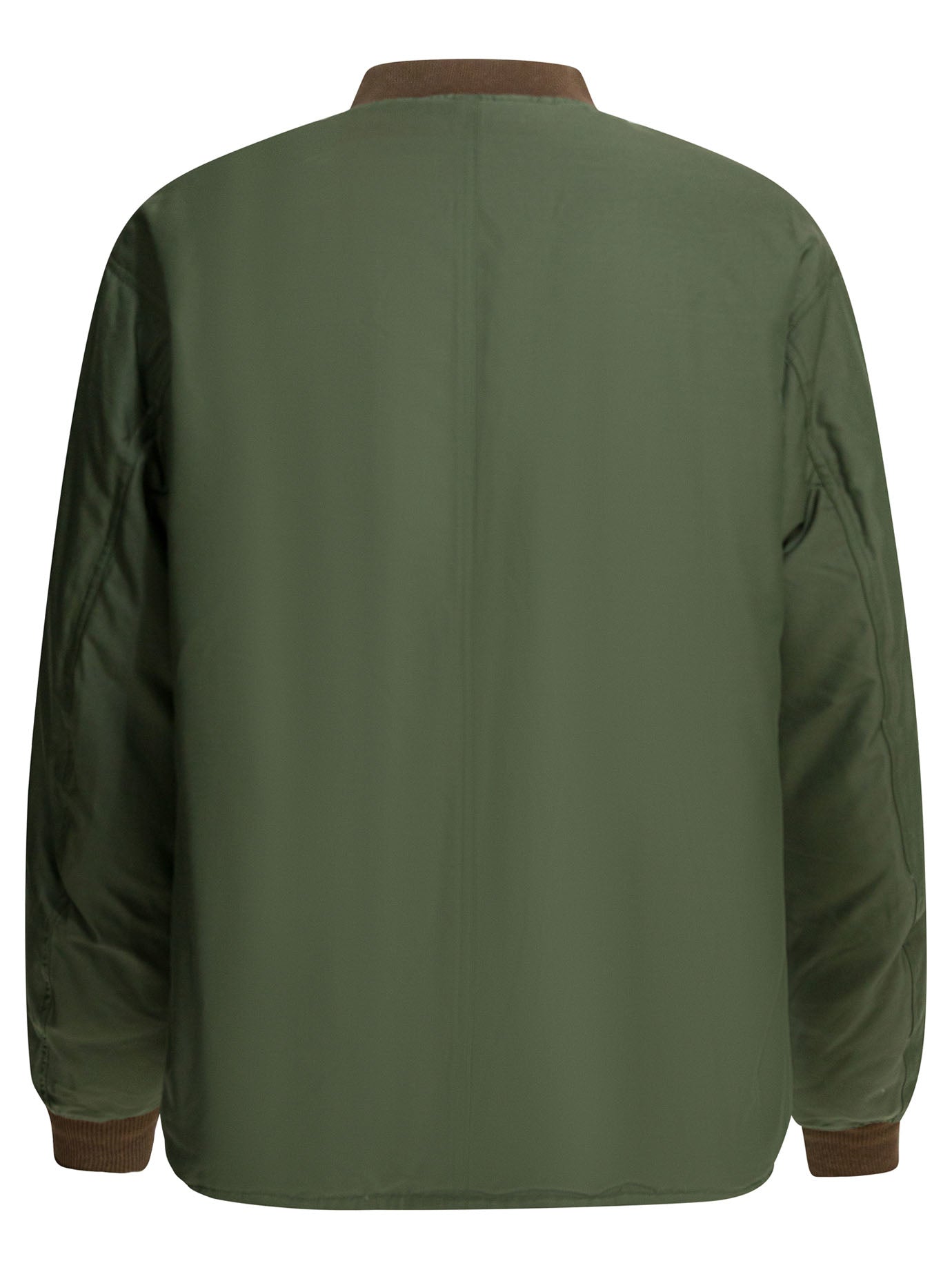 This versatile bomber-style jacket from Visvim is the perfect transitional piece for your wardrobe. Crafted in a rich olive green with contrasting brown ribbed collar and cuffs, this jacket features a classic button-front closure and practical chest and side pockets.