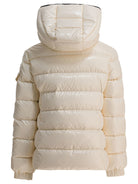 Embrace the cold weather in style with this luxurious quilted puffer jacket from Moncler Enfant. Crafted in a sophisticated cream tone with contrasting black trim, this hooded design features an asymmetric front zipper and horizontal quilting that provides both warmth and a sleek silhouette.
