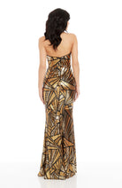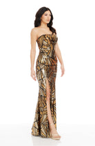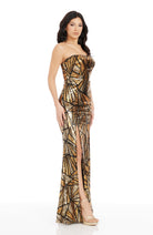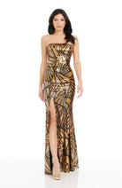 The Janelle is a striking strapless mermaid gown featuring a daring slit, designed to create a glamorous and sophisticated silhouette for any formal occasion.