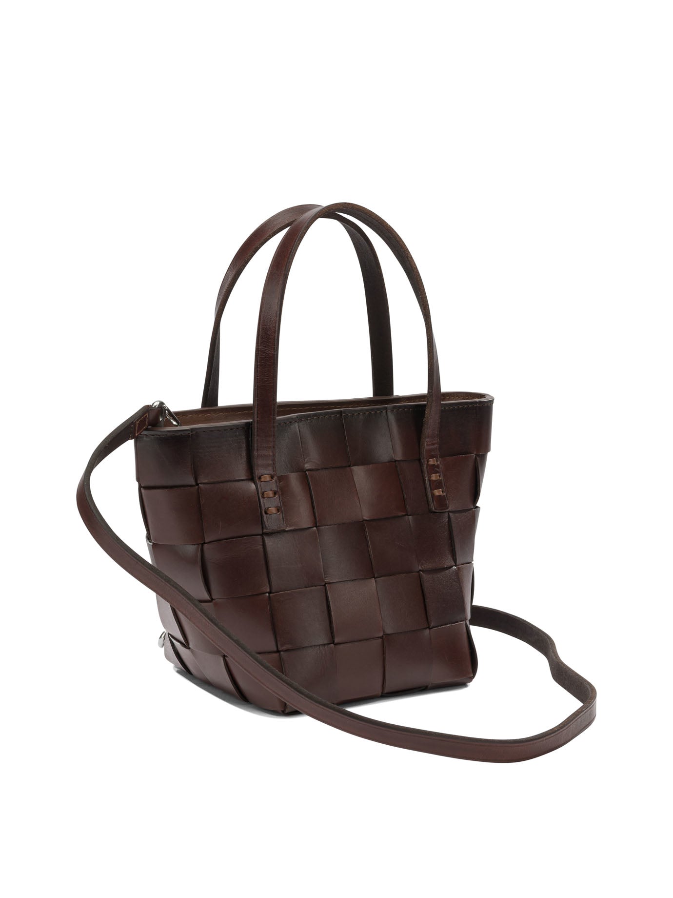 DRAGON DIFFUSION SMALL "JAPAN" HANDBAG MADE OF HAND-WOVEN COWHIDE LEATHER WITH A CRISSCROSS PATTERN. THE SEMI-RIGID STRUCTURE DEFINES THE BODY OF THE BAG, WHILE THE COMPACT SILHOUETTE FEATURES SHARP LINES AND REDUCED VOLUMES. EQUIPPED WITH A DOUBLE TOP HANDLE, IT FEATURES AN INTERIOR LINING AND THE PRESENCE OF A PENDANT IN THE SHAPE OF A ST. CHRISTOPHER MEDAL, SEWN INSIDE AS THE BRAND'S AUTHENTIC SIGNATURE.