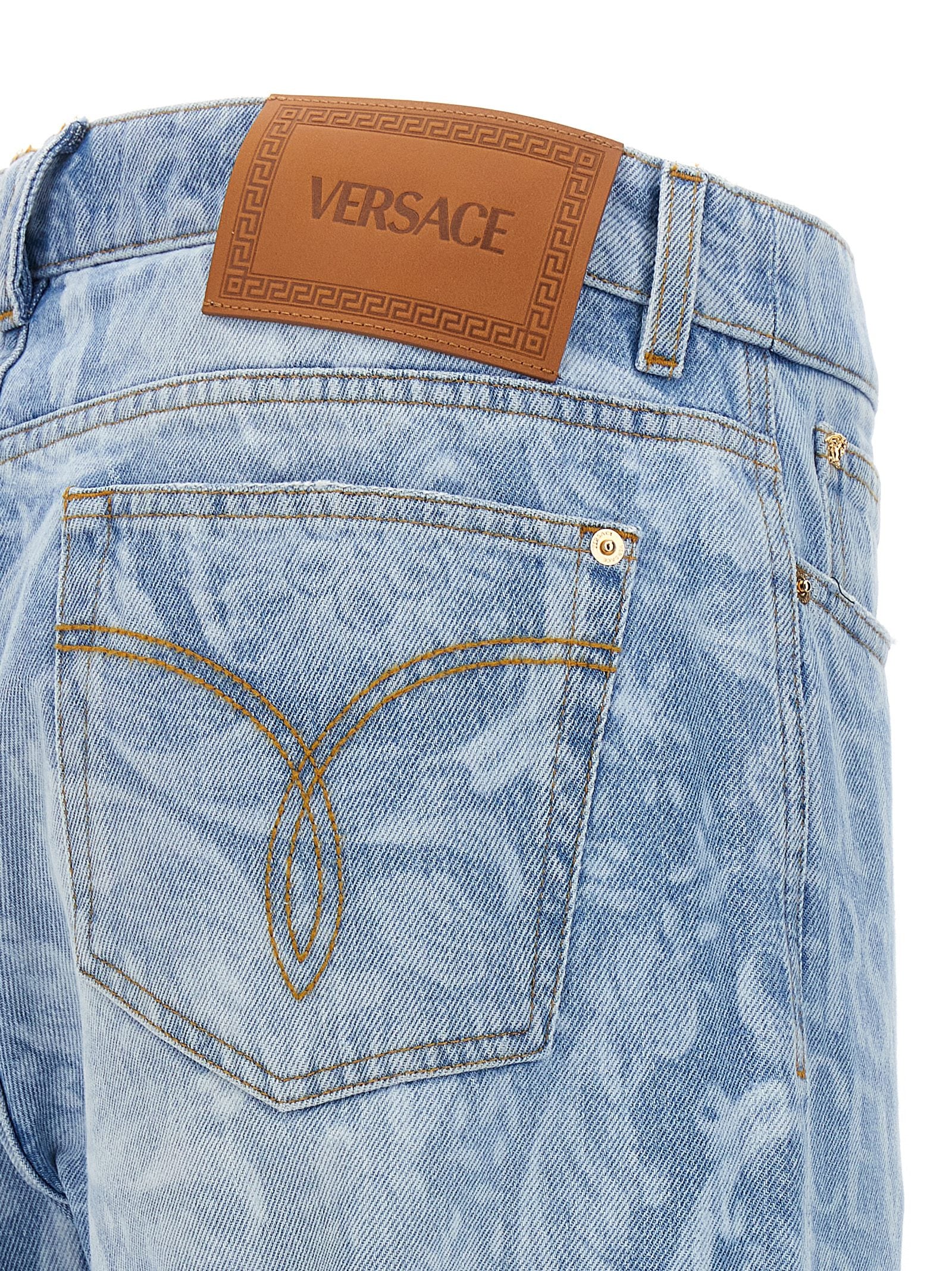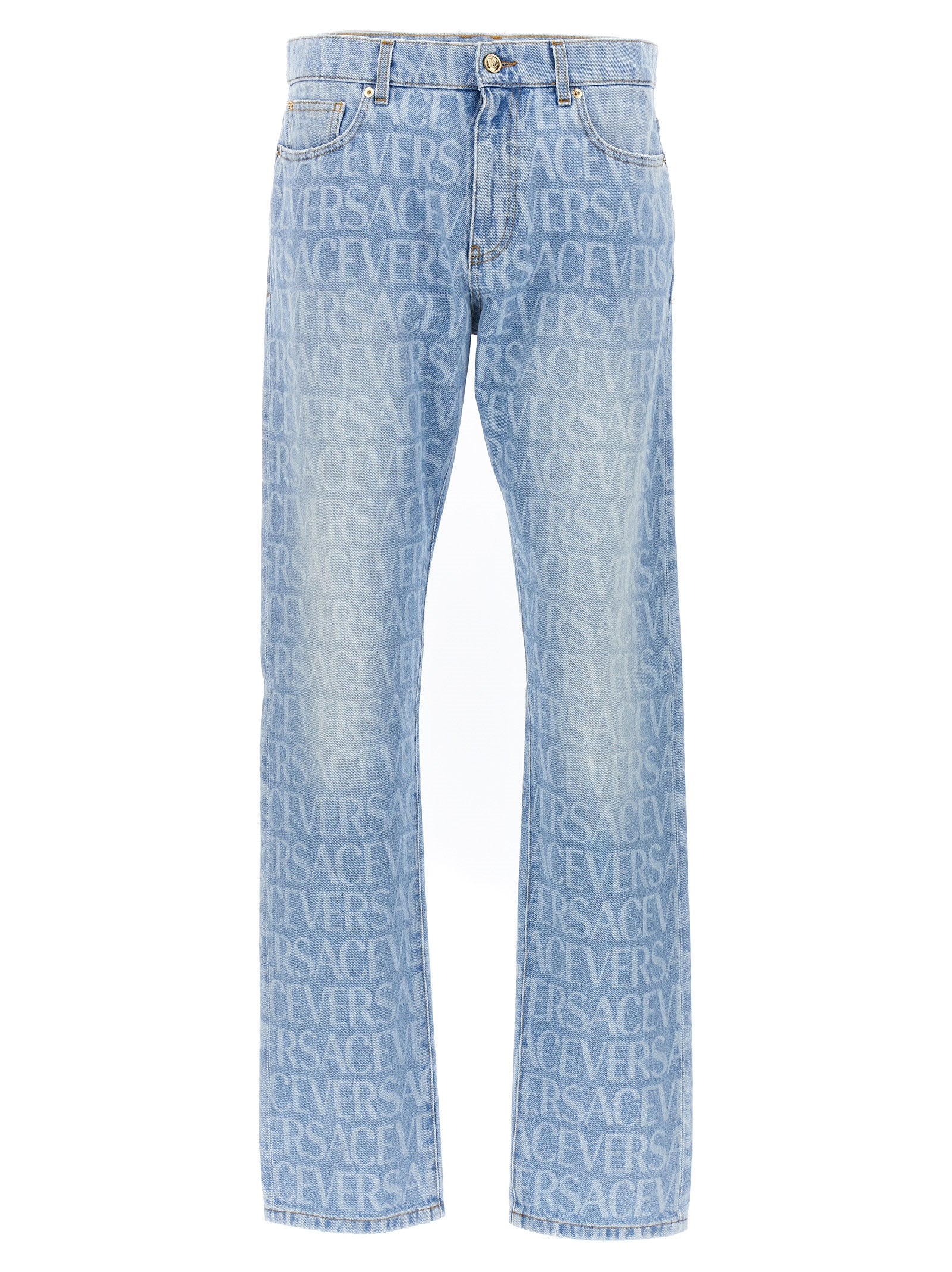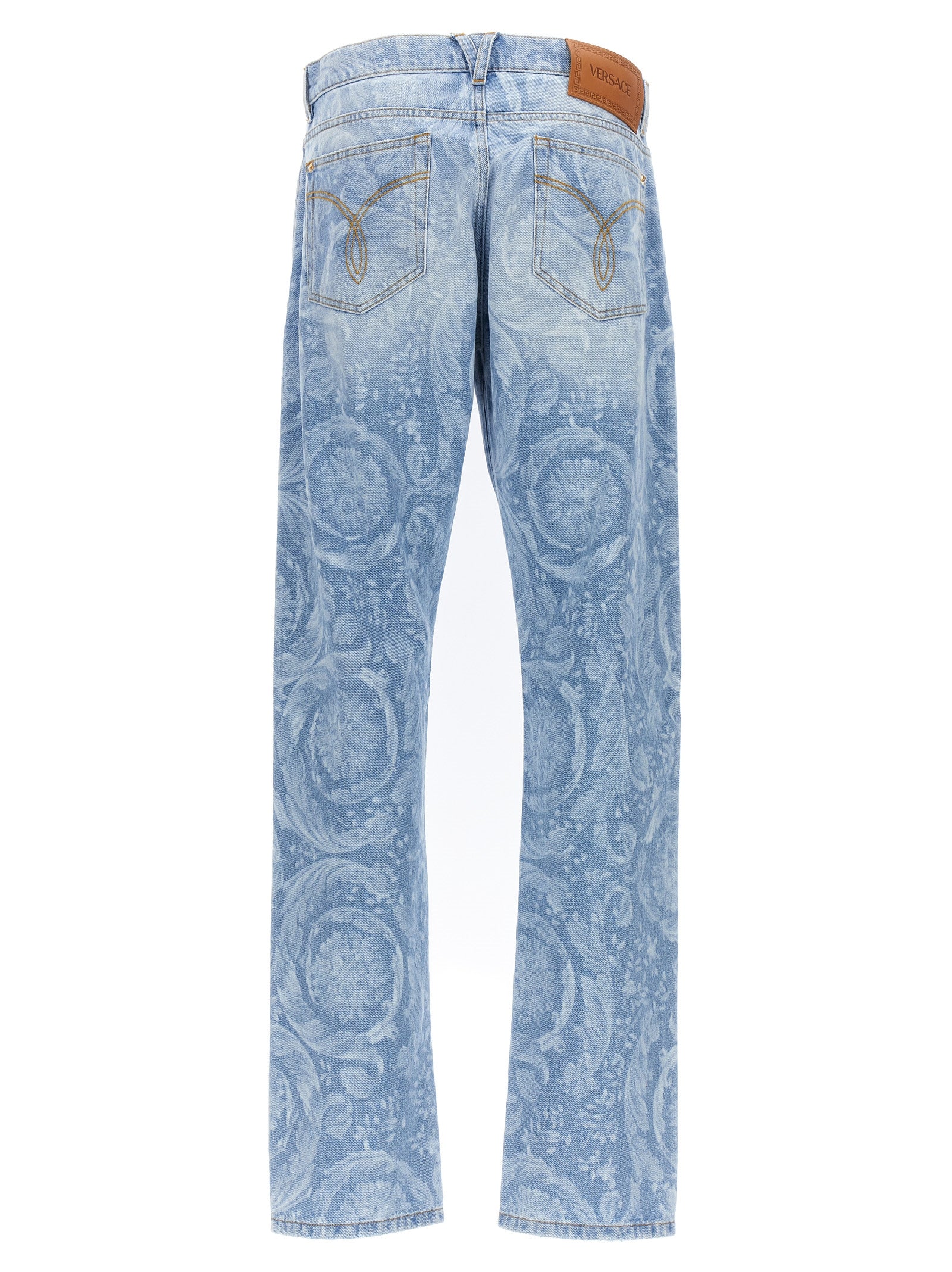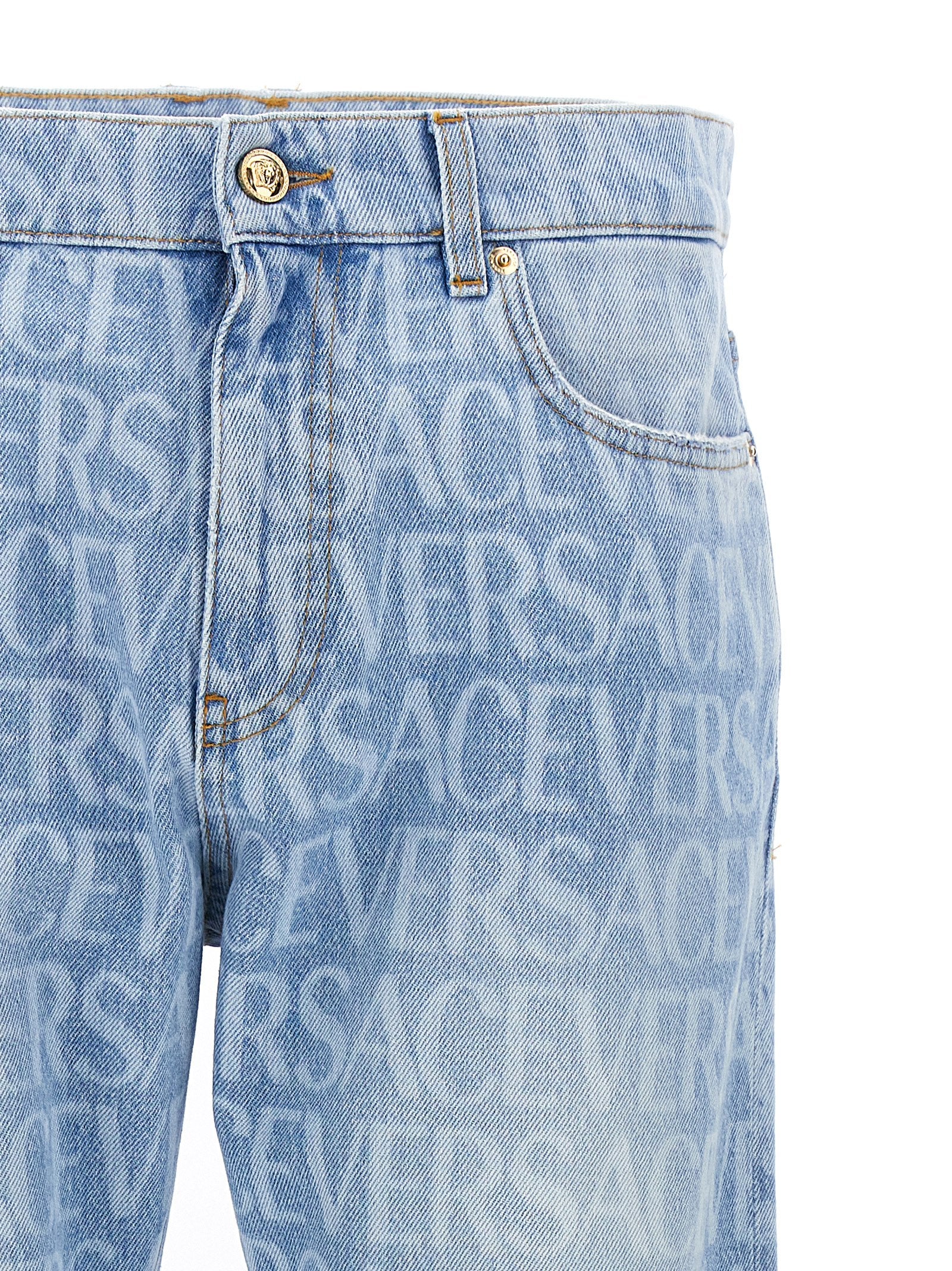 Cotton denim jeans with 'Versace Allover' pattern on the front and a 'Barocco Silhouette' pattern at the back, zip and button closure, five pockets and used-effect details.
