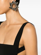 Introducing the Joni Maxi Dress by SOLACE London, a stunning statement piece crafted in luxurious jet black stretch-design crepe. This sophisticated sleeveless gown features a modern square neckline and distinctive harness-style straps that frame an alluring open back, creating an unforgettable silhouette.