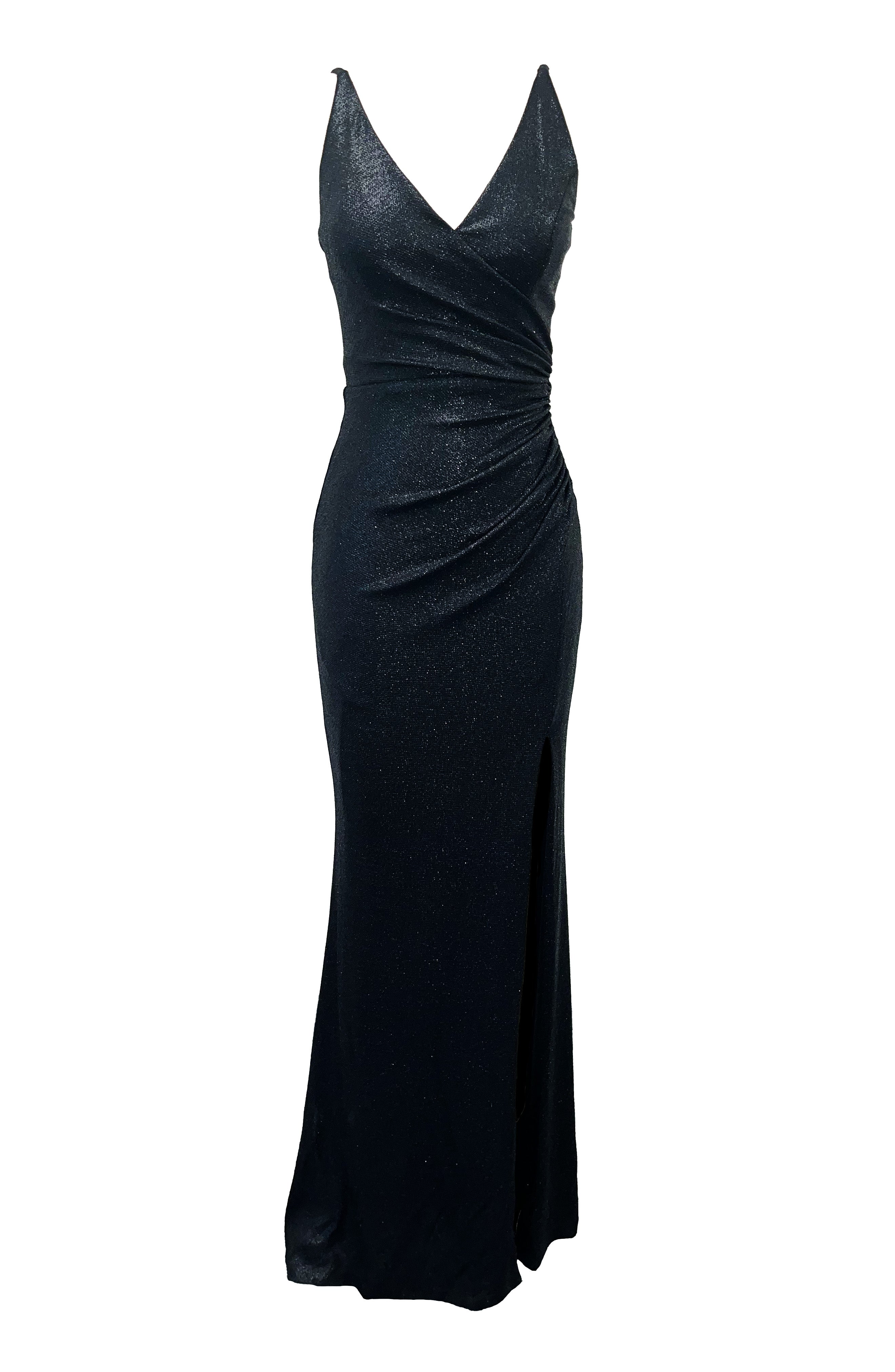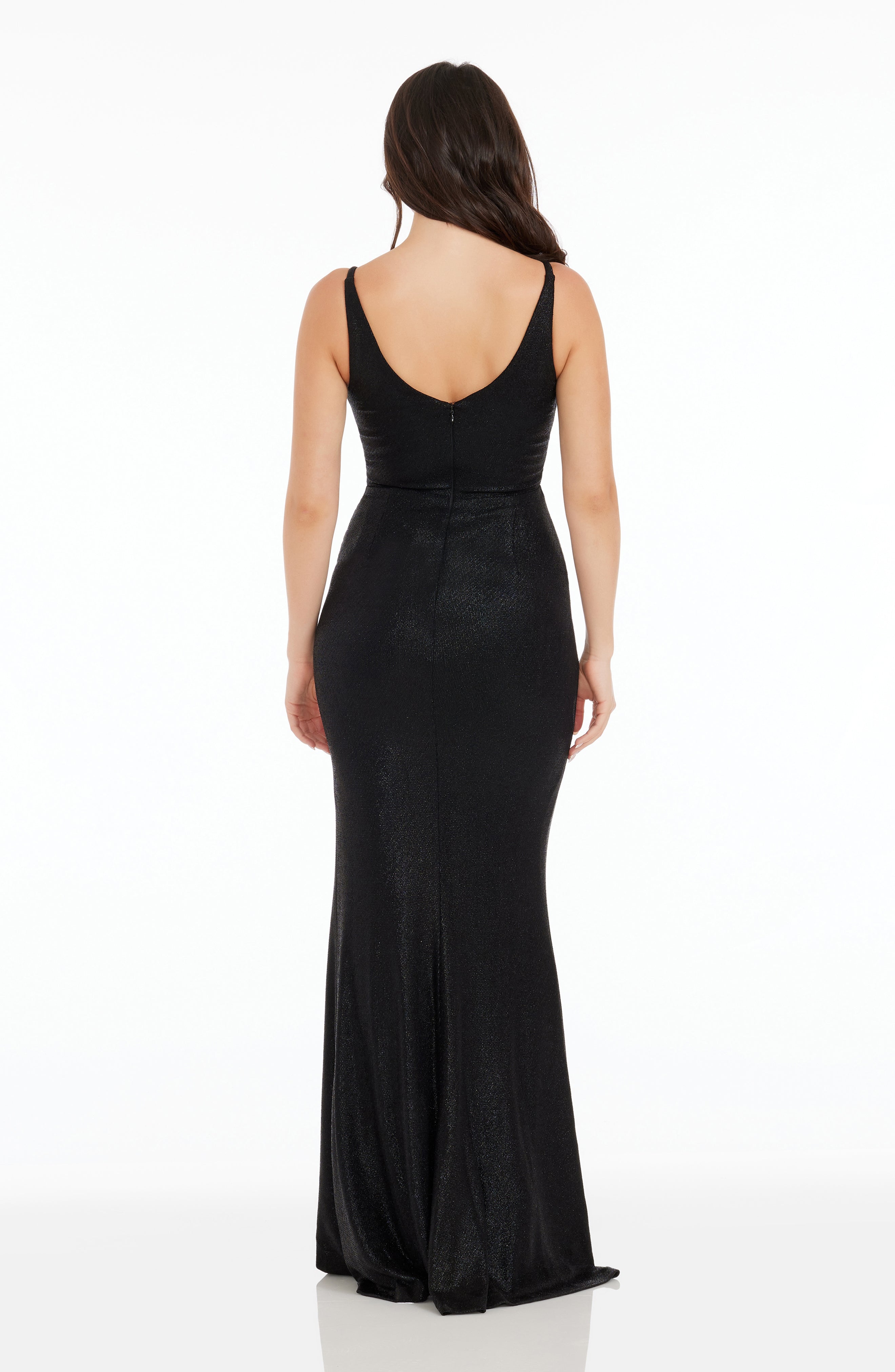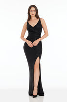 This sleeveless, rouched mermaid gown with a high slit is sure to turn heads.