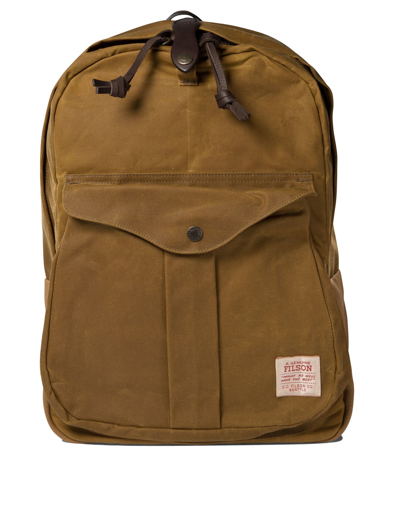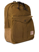 FILSON "JOURNEYMAN" BACKPACK, CONSTRUCTED OF TIGHTLY WOVEN WAXED CANVAS, PROVIDES WATERPROOFING THROUGH A RICH KEROSENE IMPREGNATION. THE 2-BY-3 INDUSTRIAL TWILL, SUPPLIED BY BRITISH MILLERAIN, IS CHOSEN FOR ITS ABRASION RESISTANCE. PADDED AND SHAPED WAXED CANVAS SHOULDER STRAPS, LINED INTERNALLY WITH COTTON MOLESKIN, ENSURE GRIP AND BREATHABILITY, WHILE THE HOOKS ARE VEGETABLE-TANNED BRIDLE LEATHER.