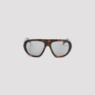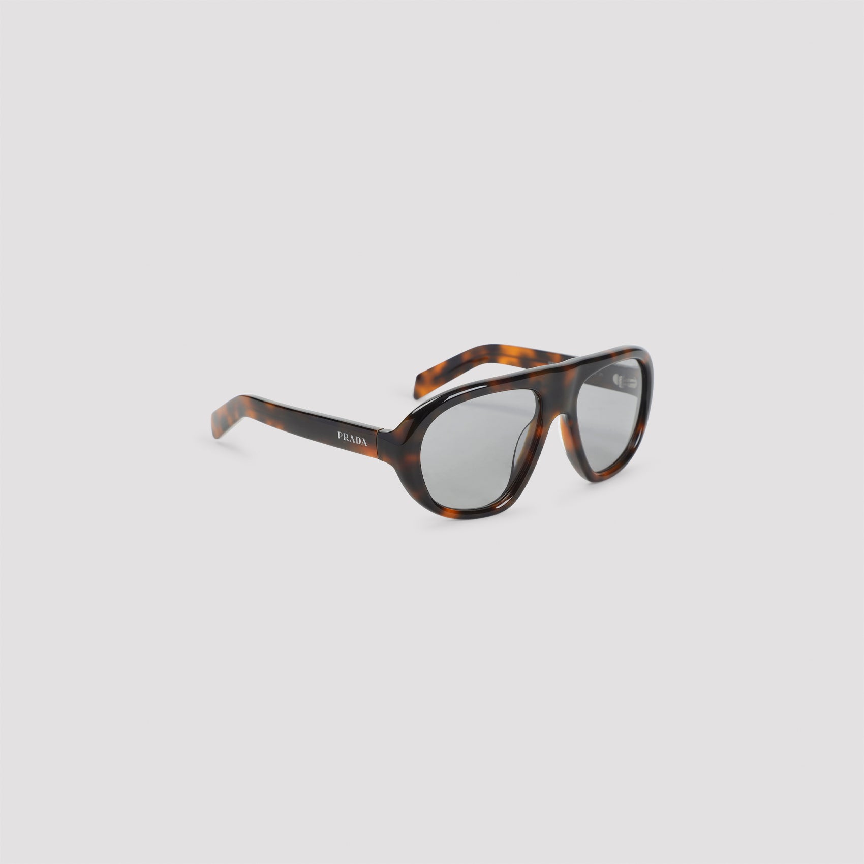 PRADA EYEWEAR JUNIPER TORTOISE BROWN ACETATE LOGO SUNGLASSES. PURE ACETATE SUNGLASSES, TORTOISE BROWN AVIATOR FRAMES, GREY LENSES, TORTOISE BROWN TEMPLES, SIDE SILVER-TONE LETTERING LOGO.
