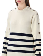 The JW Anderson Ivory Breton Jumper reimagines a timeless nautical classic with contemporary sophistication. Crafted from compact knit construction, this ivory pullover features contrasting navy stripes and distinctive horn-button openings along the sleeves for a functional yet elevated touch.
