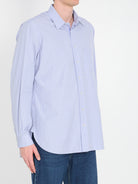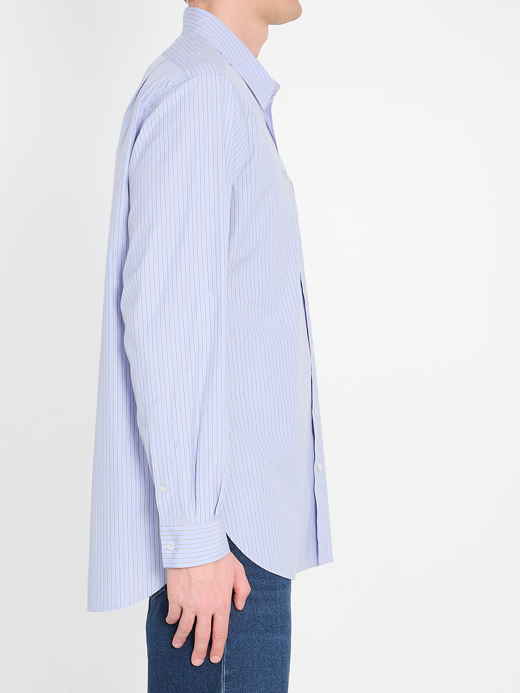 LOOSE SHIRT IN LAVENDER BLUE AND BROWN STRIPED ORGANIC COTTON POPLIN. IT FEATURES A POINT COLLAR, BUTTON FRONT CLOSURE, LONG SLEEVES, BUTTON CUFFS, ONE PATCH POCKET ON THE CHEST, AND A ROUNDED HEM. REGULAR FIT.