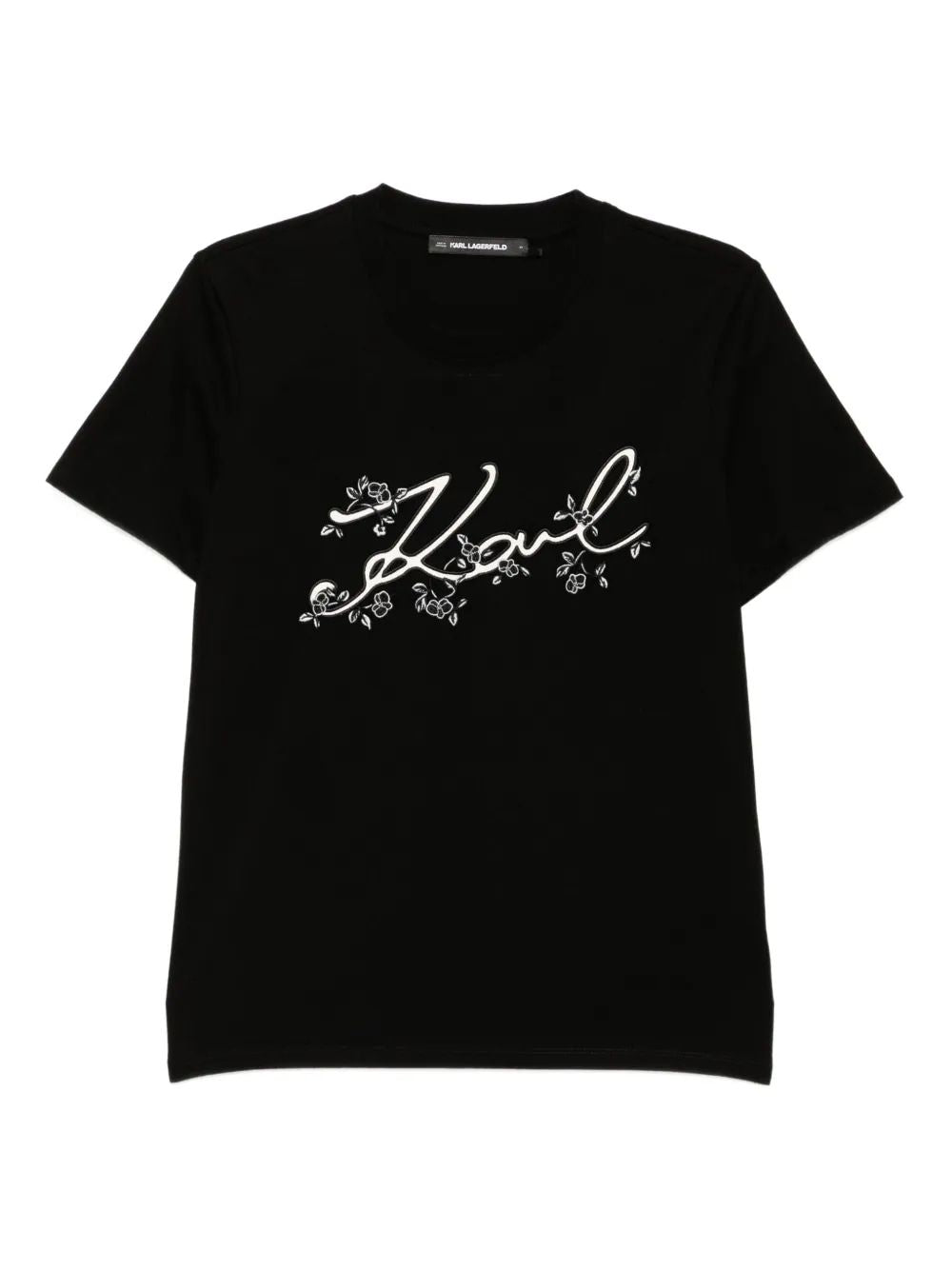 Elevate your everyday wardrobe with this sophisticated logo-embroidered t-shirt from Karl Lagerfeld. Crafted in classic black, this piece features the iconic "Karl" signature beautifully embroidered in white with delicate floral accents, adding a touch of luxury to a casual staple.