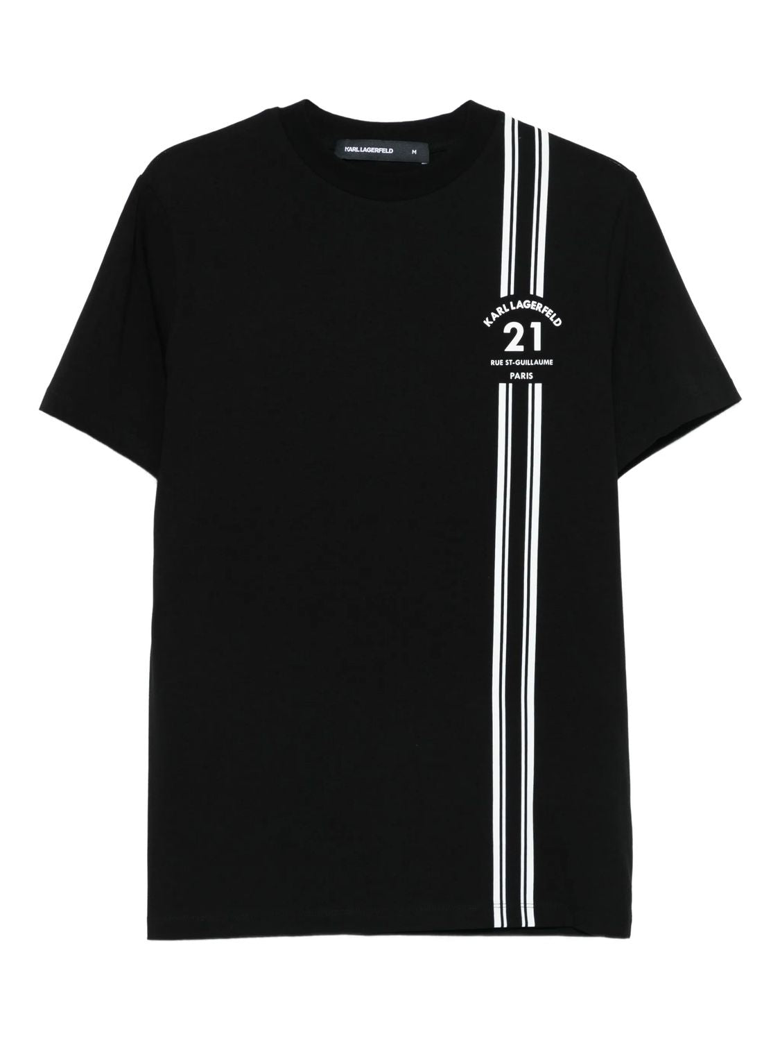Elevate your casual wardrobe with this striking Karl Lagerfeld stripe-detail cotton t-shirt. Crafted from premium cotton, this black tee features bold white vertical racing stripes and the iconic number "21" for a sporty, contemporary aesthetic.