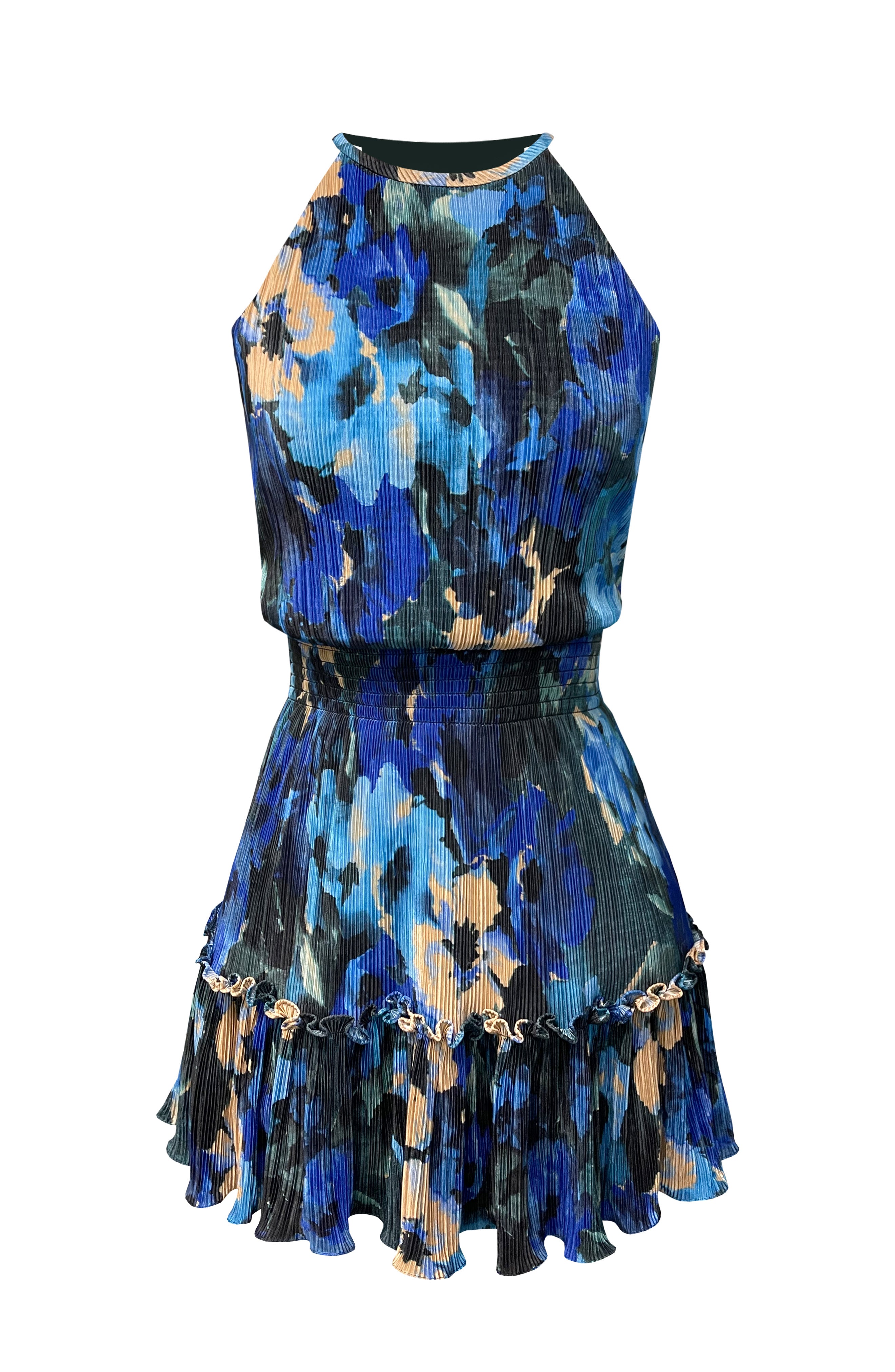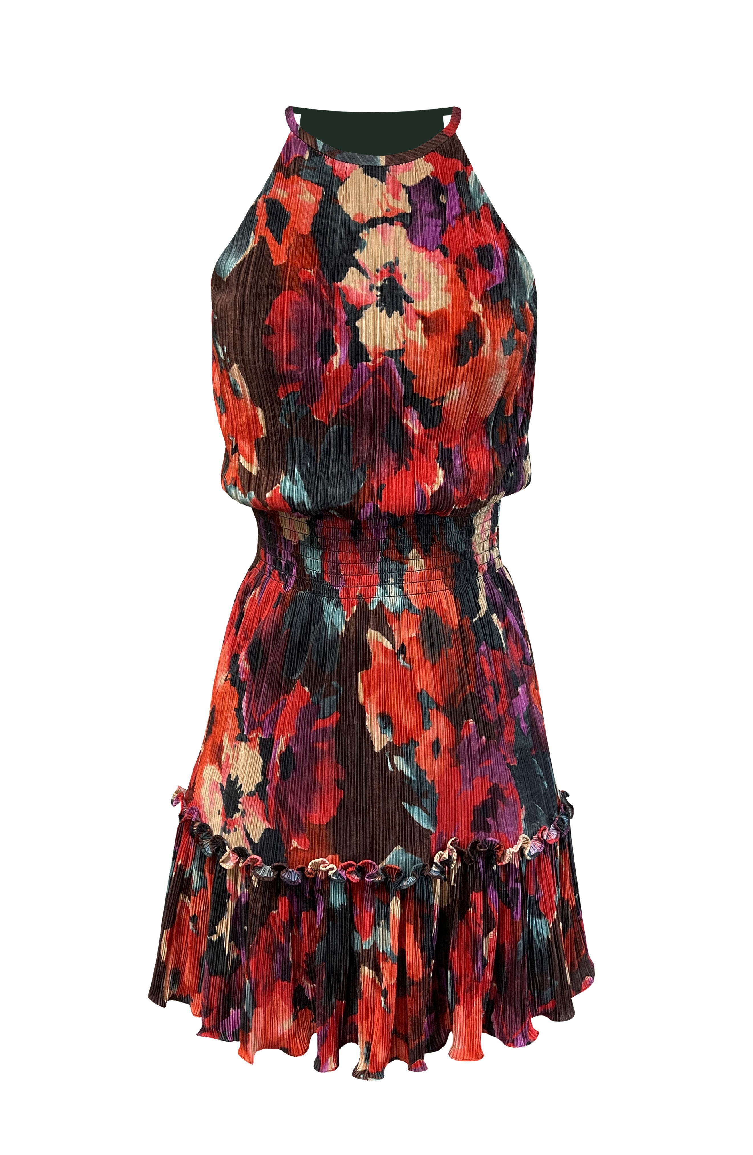 The Kaylee Dress features a halter neck, smocked waist, and fit and flare style, creating a flattering and stylish mini dress.