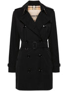 BLACK COTTON GABARDINE WEAVE ULSTER LAPELS FRONT BUTTON FASTENING LOGO-DEBOSSED BUTTONS EPAULETTES LONG SLEEVES BELTED CUFFS STORM FLAP TO THE FRONT/REAR BELTED WAIST TWO FRONT BUTTON-FASTENING JETTED POCKETS AMERICAN REAR VENT STRAIGHT HEM VINTAGE CHECK-PATTERN LINING MID-LENGTH