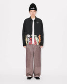 Make a bold statement with the Kenzo Futura Heavy Coach Jacket, a striking piece that seamlessly blends streetwear edge with high-fashion artistry. This classic black coach jacket features a distinctive illustrated graphic along the hem, showcasing Kenzo's signature playful aesthetic with vibrant, hand-drawn figures in a spectrum of colors.