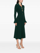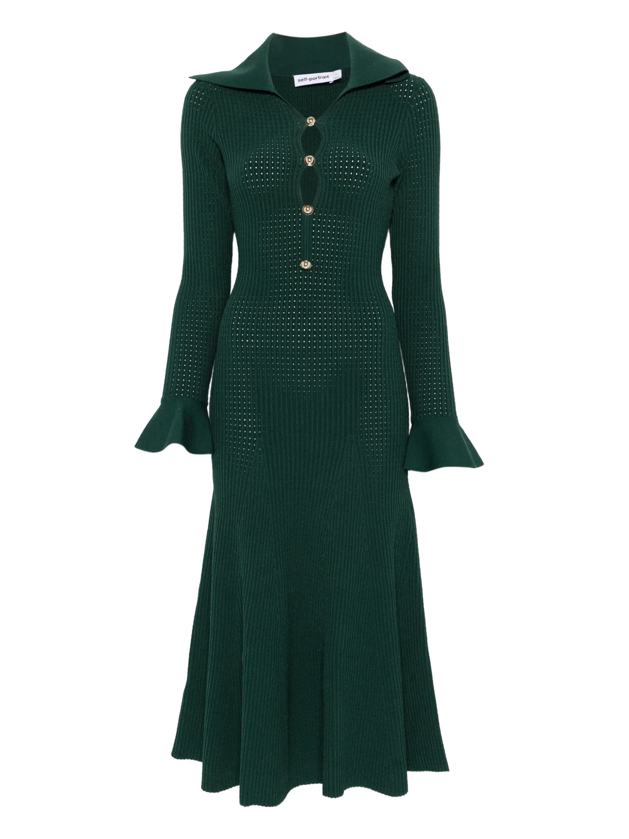 Elevate your knitwear collection with this sophisticated Keyhole Knit Midi Dress from Self-Portrait. This elegant piece features an oversized collar, flared cuffs, and gleaming gold button details that add a touch of refined luxury to the textured knit fabrication.