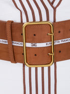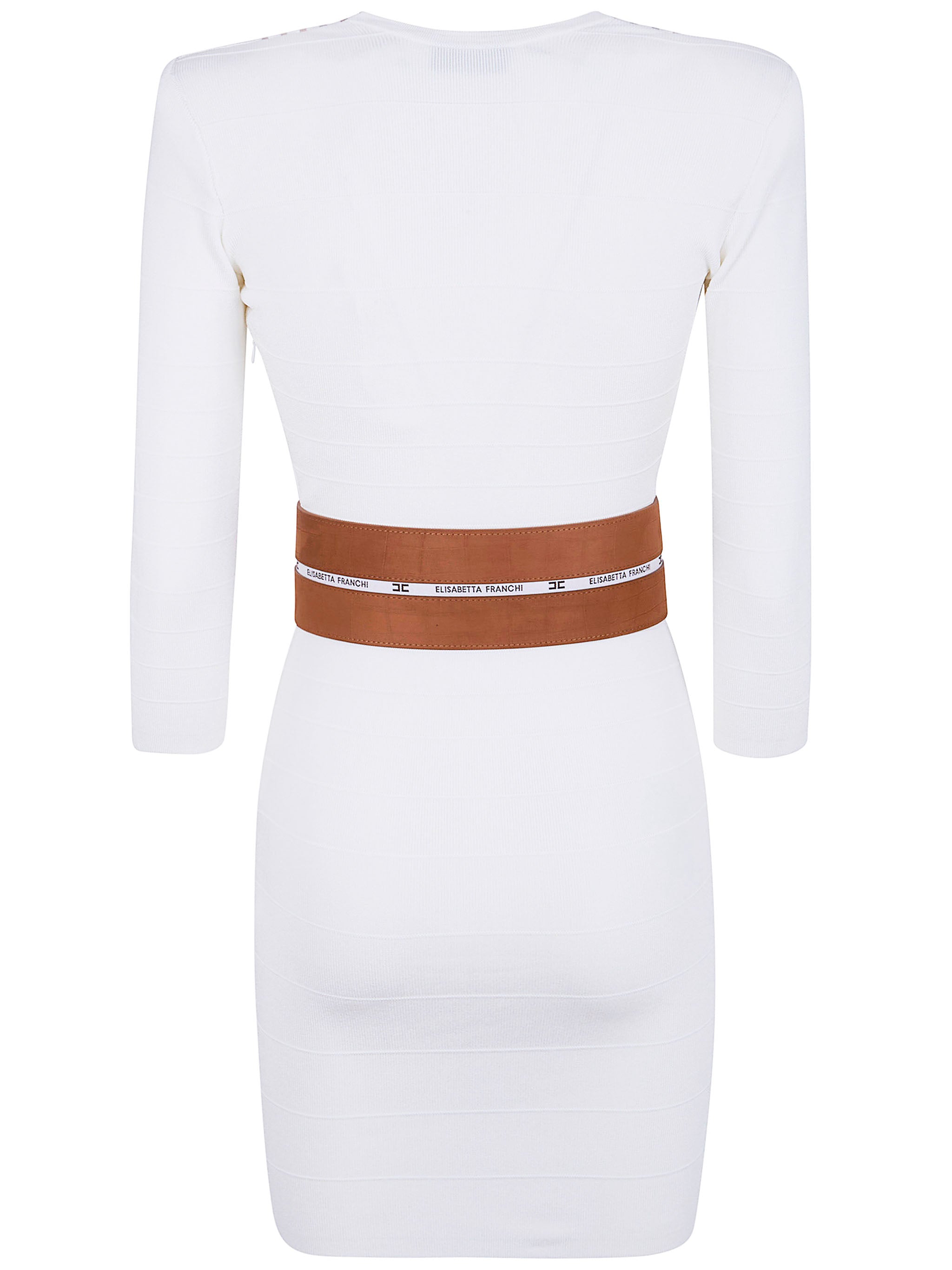 Elevate your wardrobe with this sophisticated Knit Fabric Dress with Striped Bands from Elisabetta Franchi. Crafted from a luxurious blend of 75% viscose and 25% polyamide, this dress features a flattering slim fit silhouette with padded shoulders for a polished, structured look.