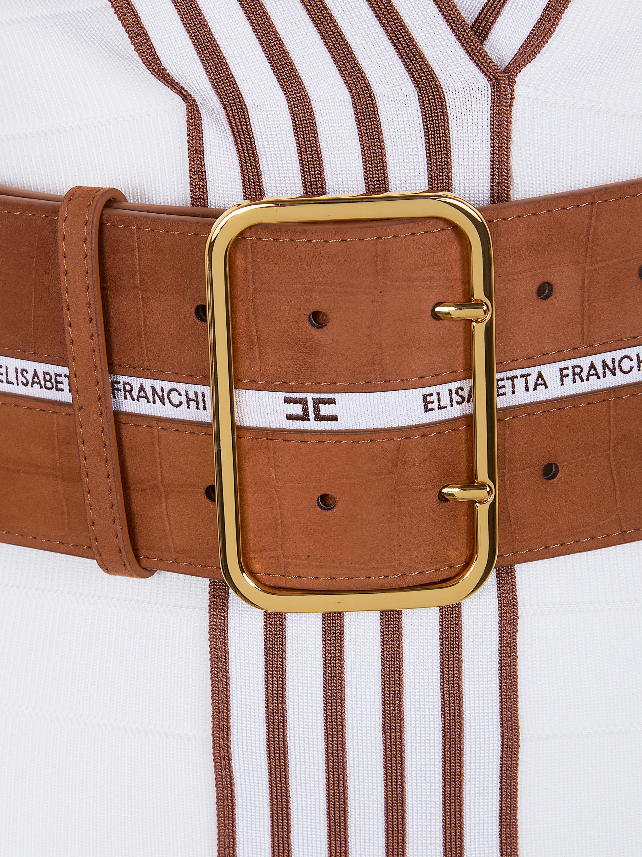 The striking vertical striped bands create an elongating effect, while the deep V-neckline adds a touch of allure. The accompanying brown belt cinches at the waist, accentuating your curves and adding a refined finishing touch.