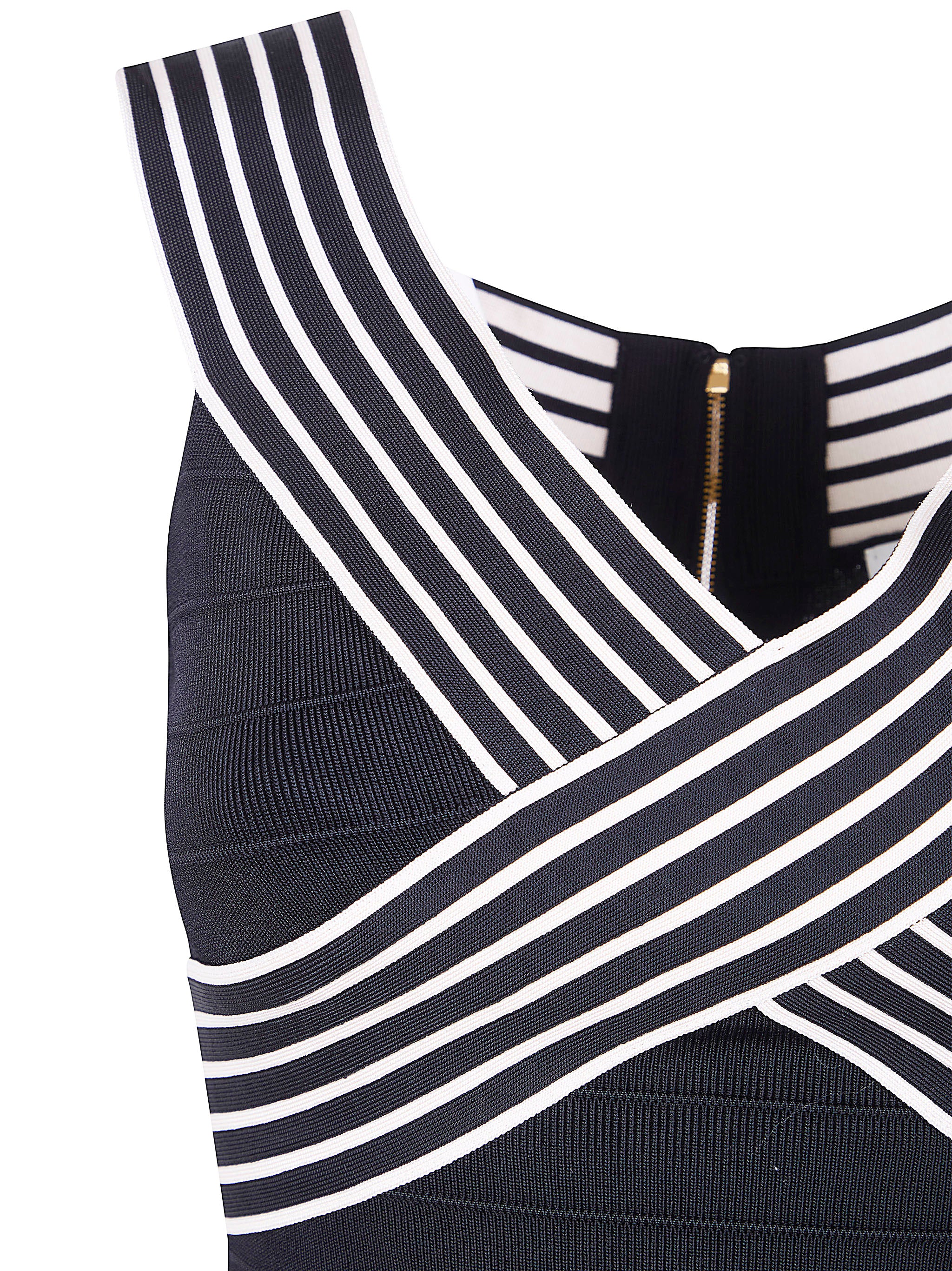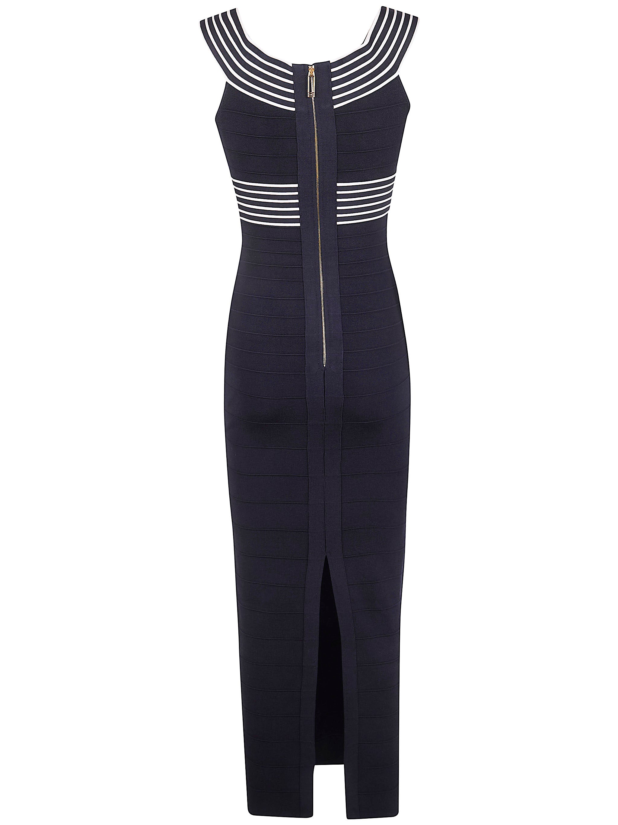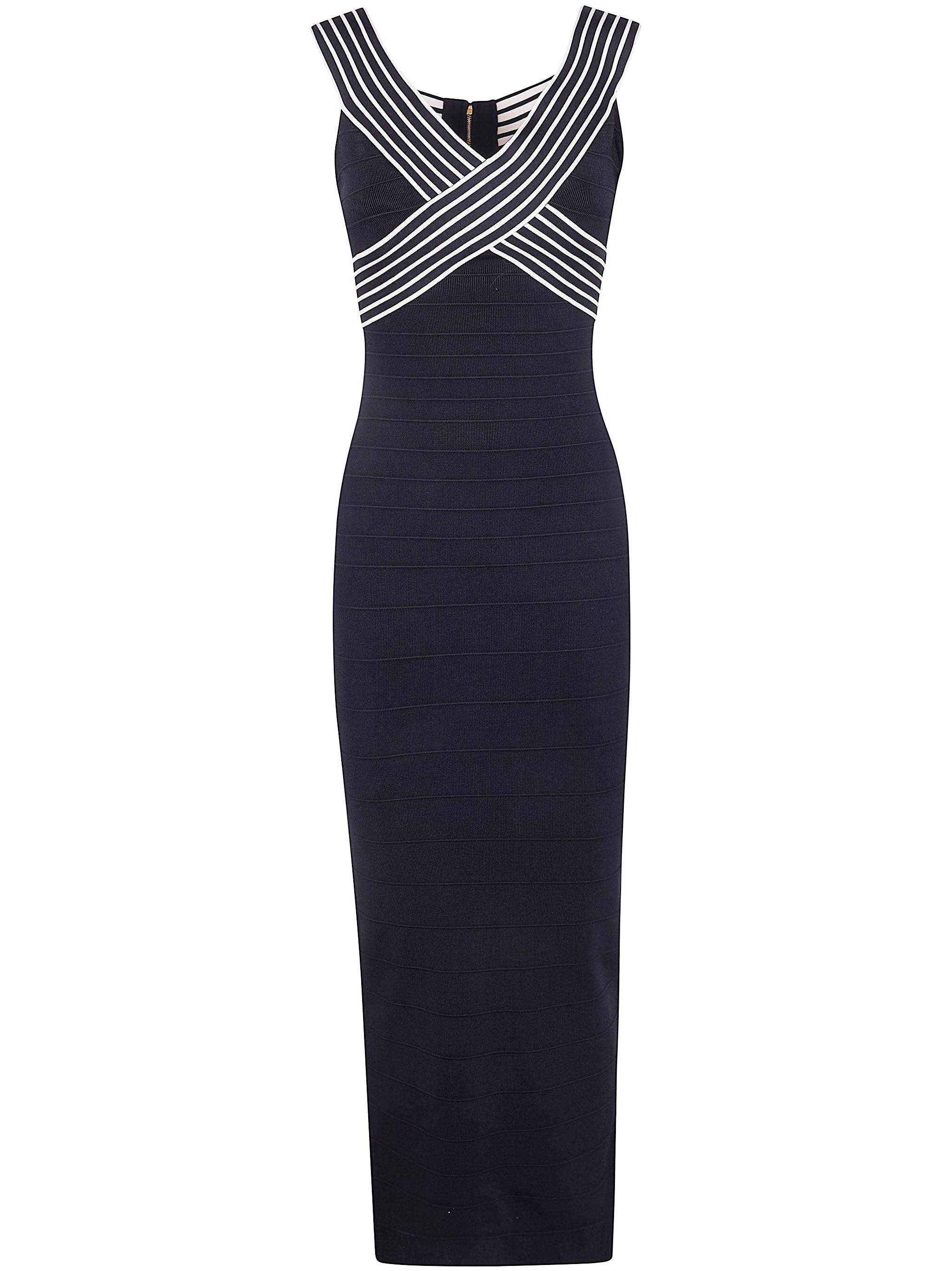Elevate your wardrobe with this stunning Knit Long Dress with Striped Bands from Elisabetta Franchi. This sophisticated midi dress features eye-catching contrast striped bands that elegantly cross over the bodice, creating a flattering V-neckline and adding visual interest to the sleek silhouette.