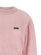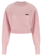 The sweater showcases dramatic long puff sleeves with ribbed cuffs and a dropped shoulder design for an effortlessly chic, relaxed fit. A subtle front logo patch adds designer distinction to the classic crew neckline.