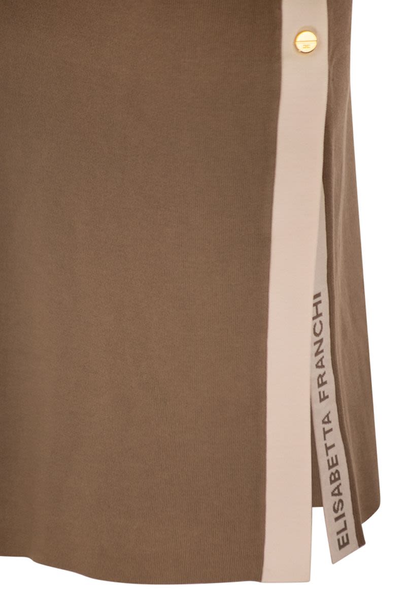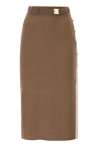 KNITTED MIDI SKIRT. IT STANDS OUT FOR ITS SHINY VISCOSE BANDS AND JACQUARD DETAILING ON THE LOGO, WHICH IS FEATURED ON THE SIDE SLIT. THE CONTRASTING COLOURS EMPHASISE THE GARMENT'S GRAPHIC DESIGN. THE WAISTBAND HAS A GOLD METAL PLAQUE WITH LOGO FOR A FINAL STYLISH DETAIL. - SLIM FIT - WAISTBAND - GOLD METAL BUTTONS WITH LOGO DESIGNER ID: GK27S61E2 727