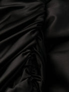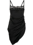 LA SAUDADE BRODÉE SATIN MINIDRESS FROM JACQUEMUS FEATURING BLACK, SATIN WEAVE, TULLE PANEL, FLORAL EMBROIDERY, RUCHED DETAILING, SQUARE NECK, REAR BUCKLE FASTENING, ADJUSTABLE SPAGHETTI STRAPS, DRAPED DETAILING, OPEN BACK, ASYMMETRIC HEM AND ABOVE-KNEE LENGTH.