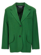 Elevate your wardrobe with the 'La veste Titolo' blazer from Jacquemus. This sophisticated single-breasted blazer is crafted from a luxurious linen and wool blend in a striking green hue that adds a fresh, modern touch to any ensemble.