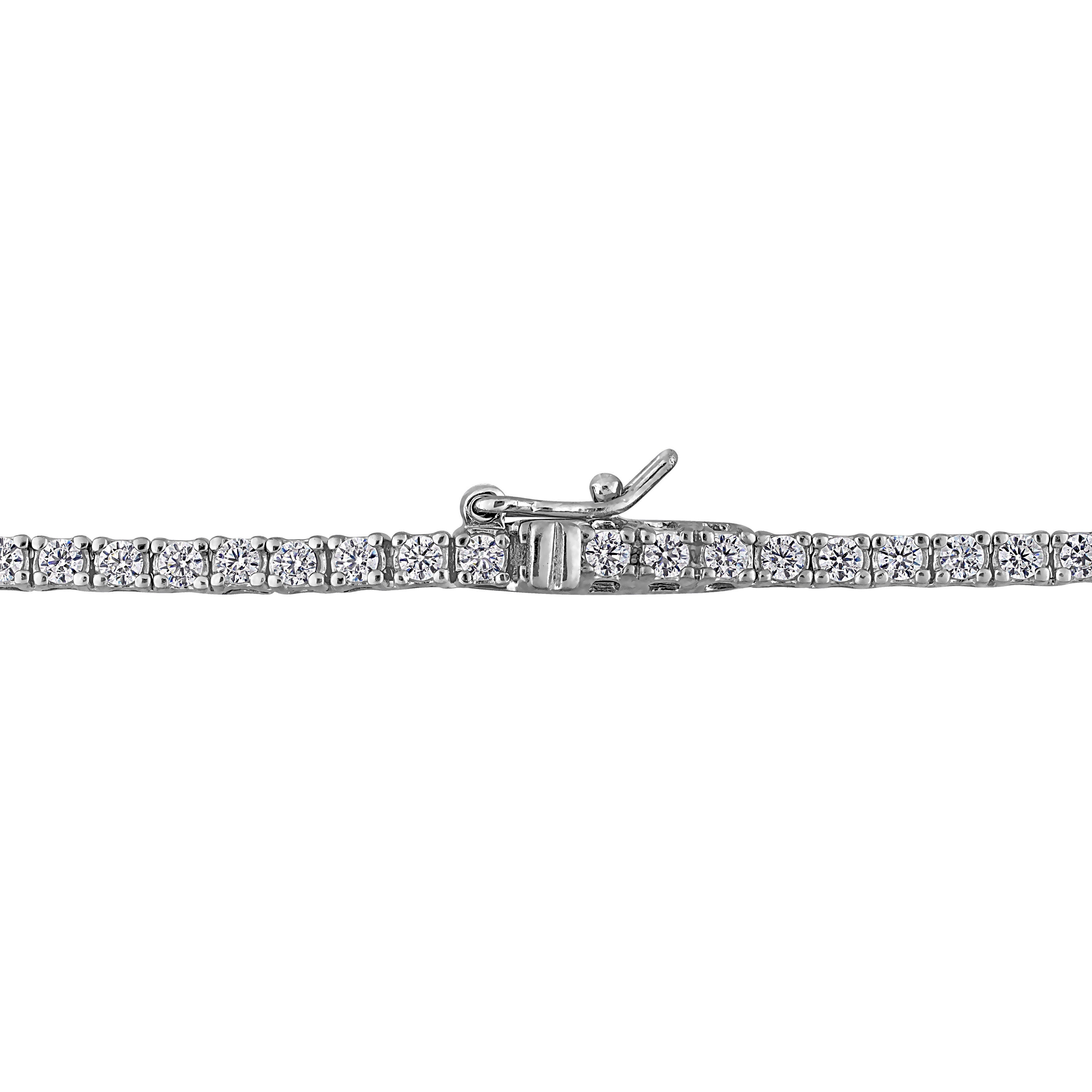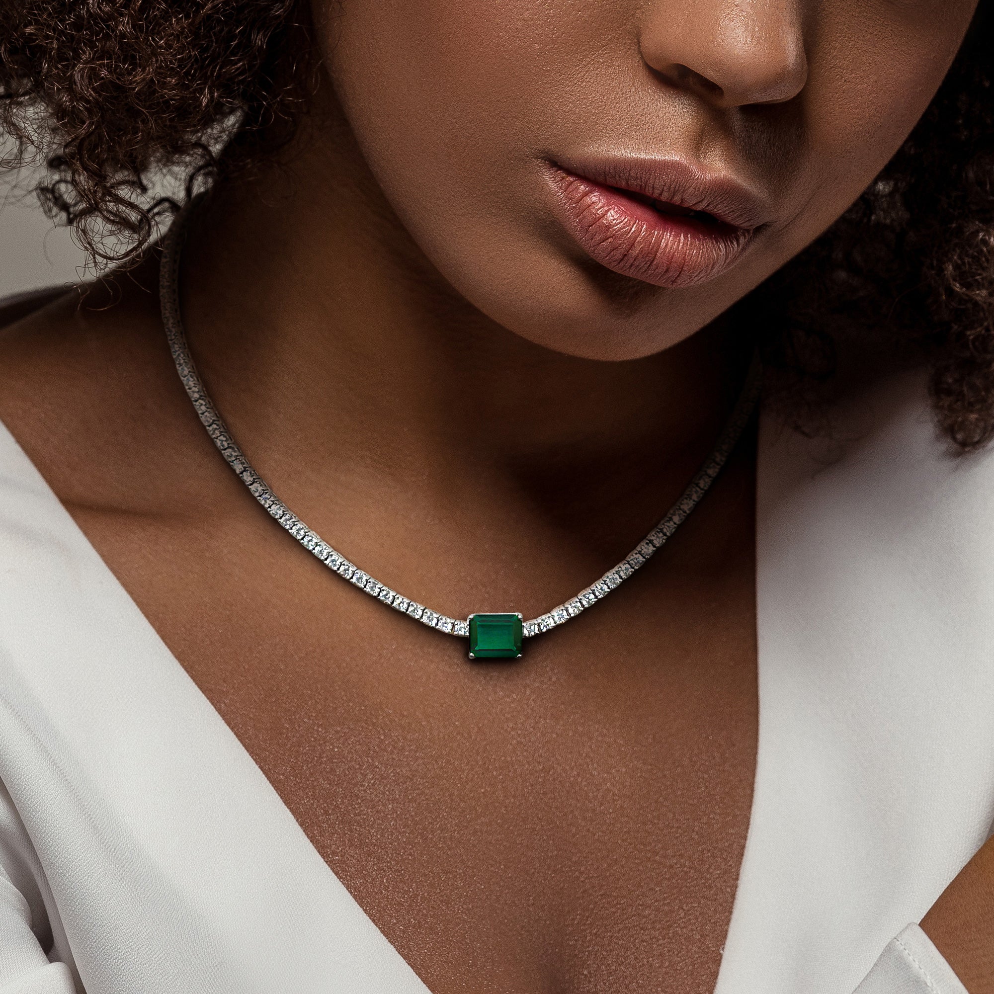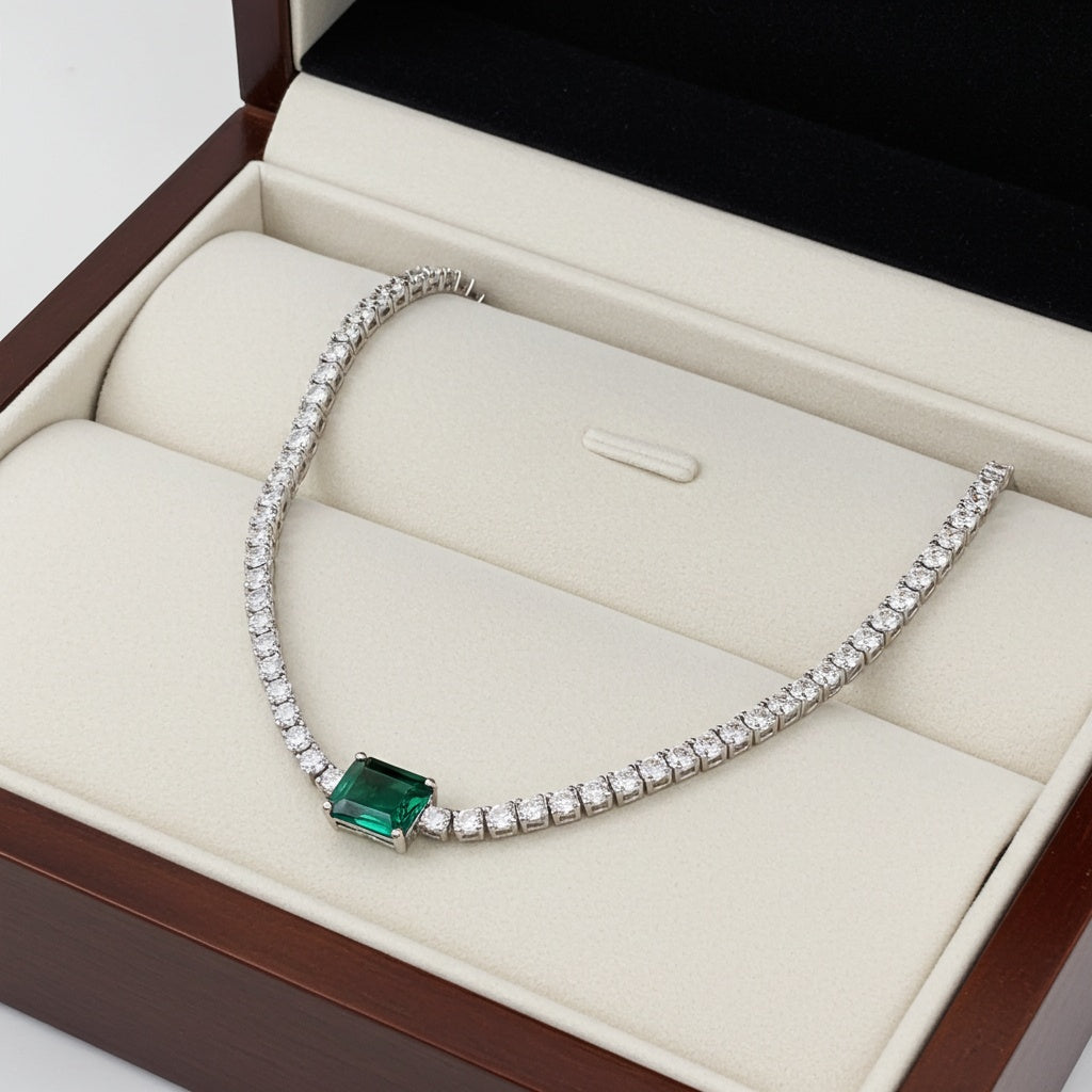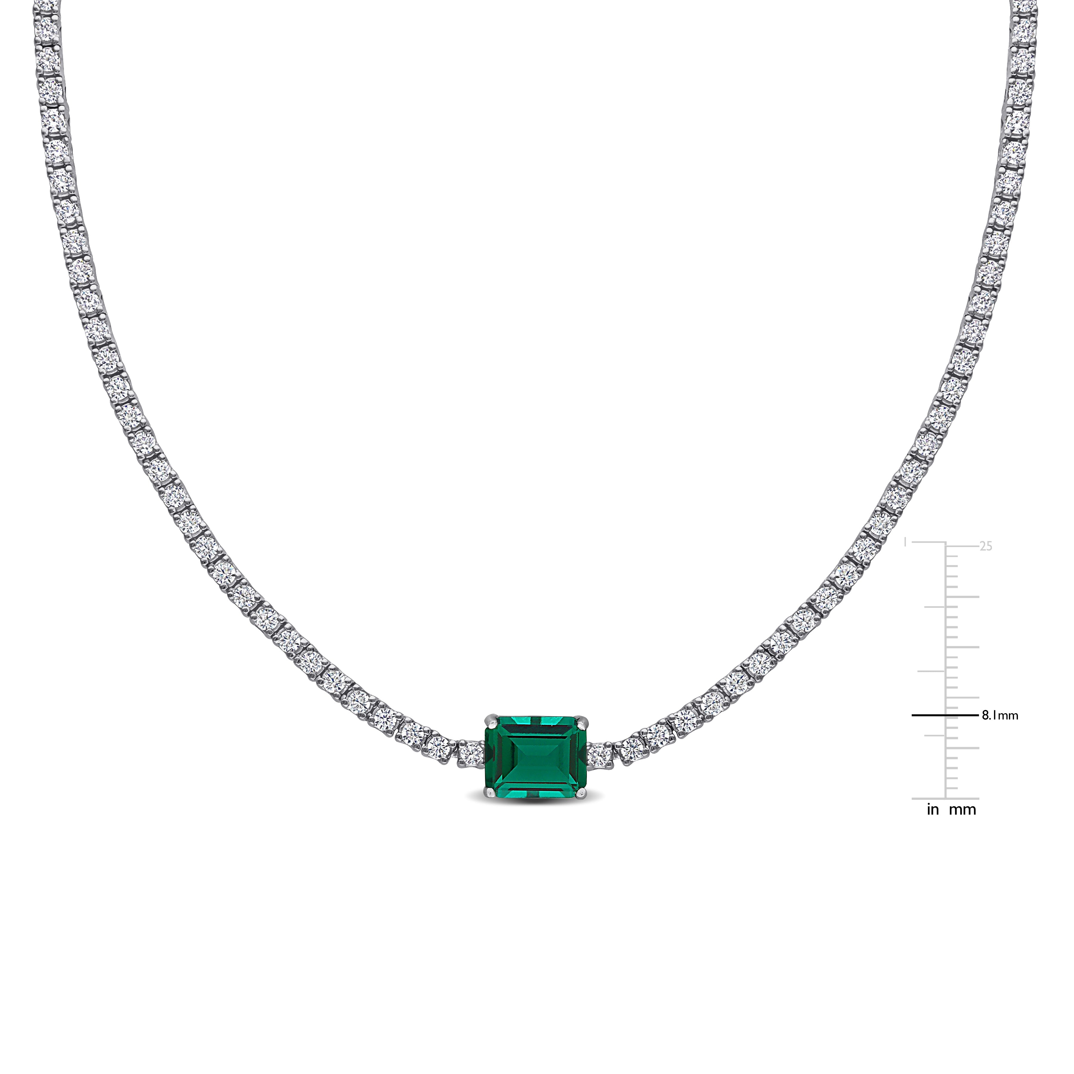 This exquisite solitaire tennis necklace features a lab-created emerald and lab-created white sapphire set in sterling silver. The lab-created emerald, with its rich green hue reminiscent of nature's lush beauty, is the focal point of the necklace, surrounded by sparkling lab-created white sapphires that enhance its allure. The sterling silver setting provides a polished and durable frame for the gems, ensuring they shine brightly with every movement. Perfect for adding a touch of glamour to any ensemble, this 17-inch necklace exudes sophistication and elegance, making it an ideal choice for both formal events and everyday wear.