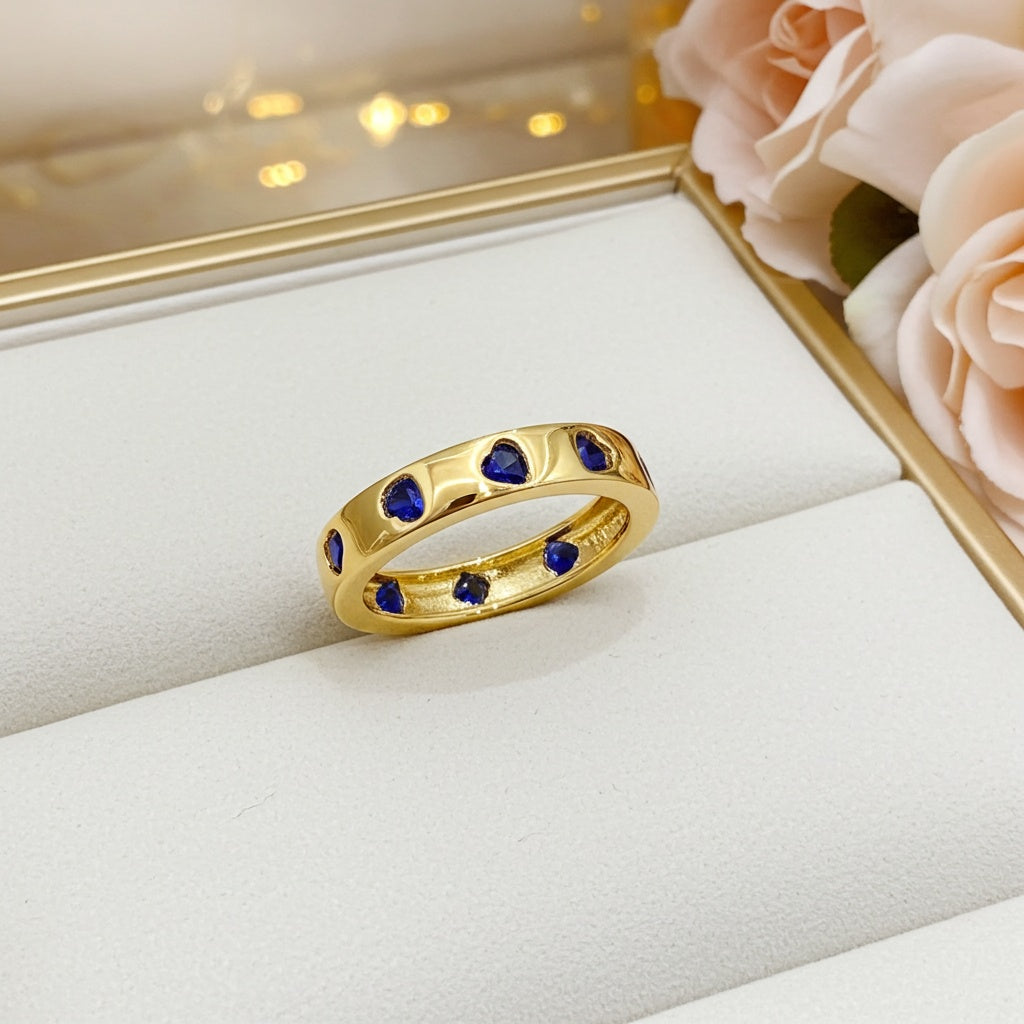 This eternity ring showcases heart-cut lab-created gemstones set in sterling silver. The lab-created gems, known for their deep color and durability, are cut into heart shapes to symbolize love and passion. The sterling silver setting adds a warm and luxurious tone to the ring, enhancing the vivid color of the gemstones. Perfect for expressing everlasting love or as a vibrant statement piece, this ring is an elegant addition to any jewelry collection.