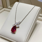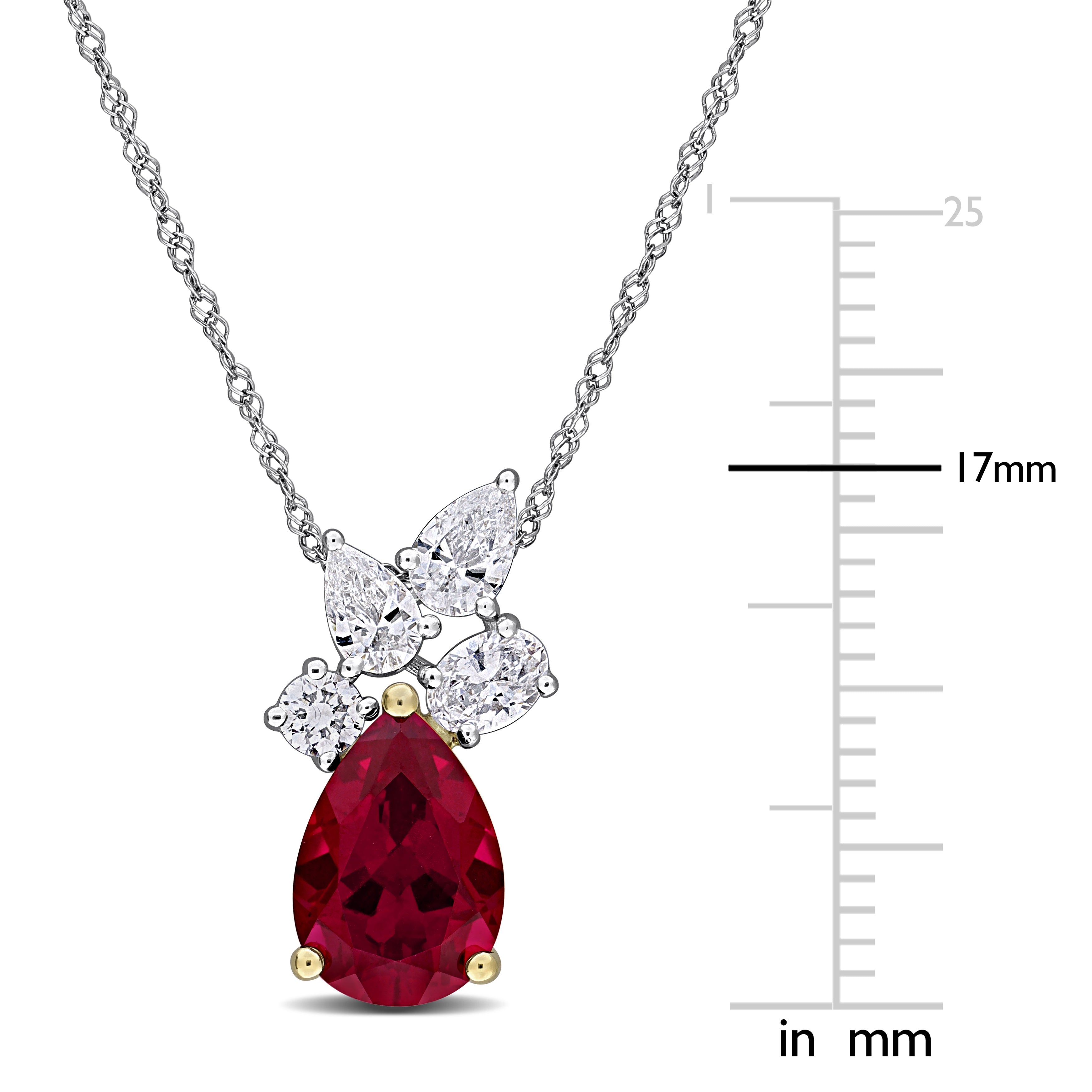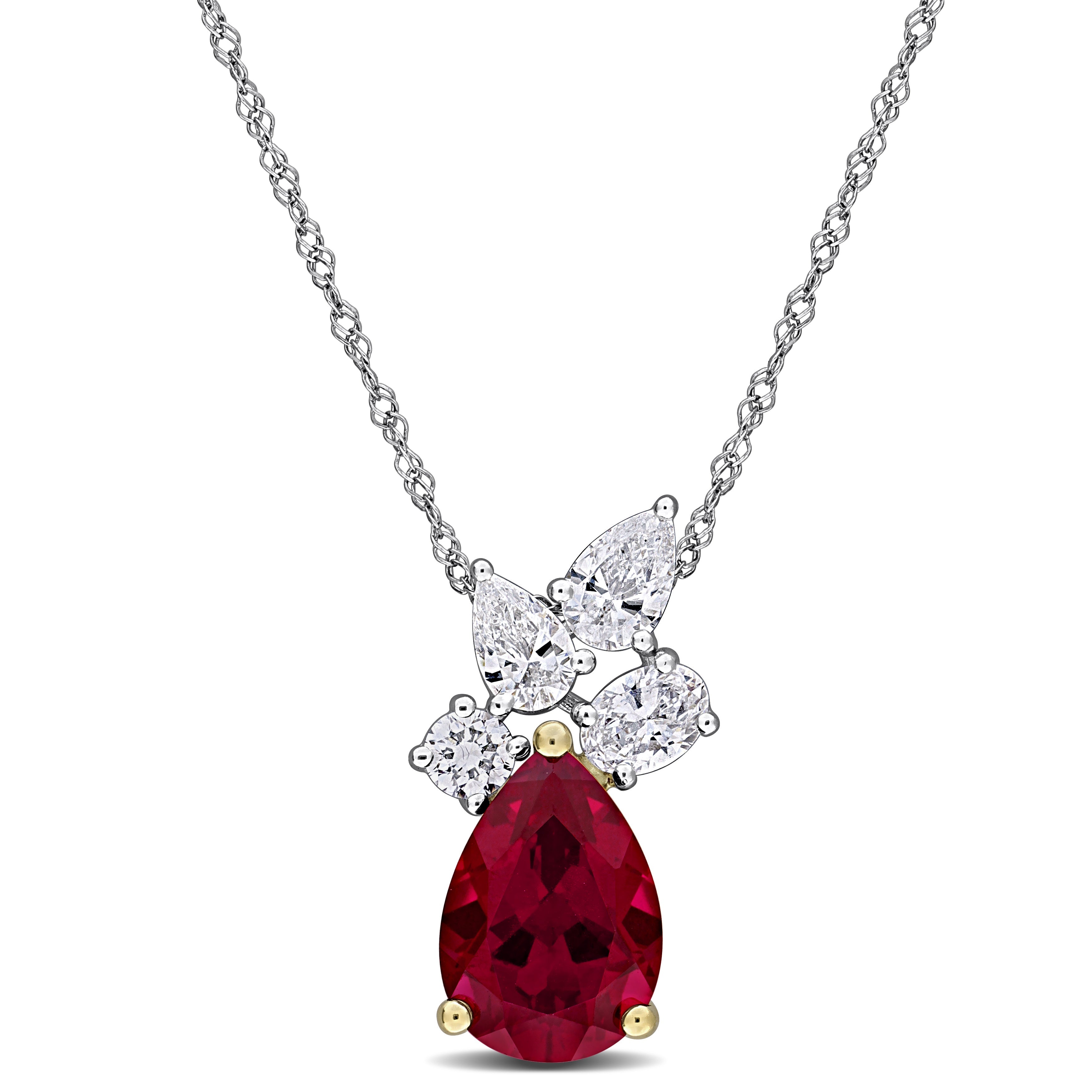 This stunning necklace is crafted in 18-karat white gold and showcases a large 10x7mm pear-cut lab-created ruby with dazzling pear, oval and round-cut lab-grown diamonds in a lovely cluster teardrop design. This necklace is complete with an 18-inch chain that secures with a spring ring clasp.