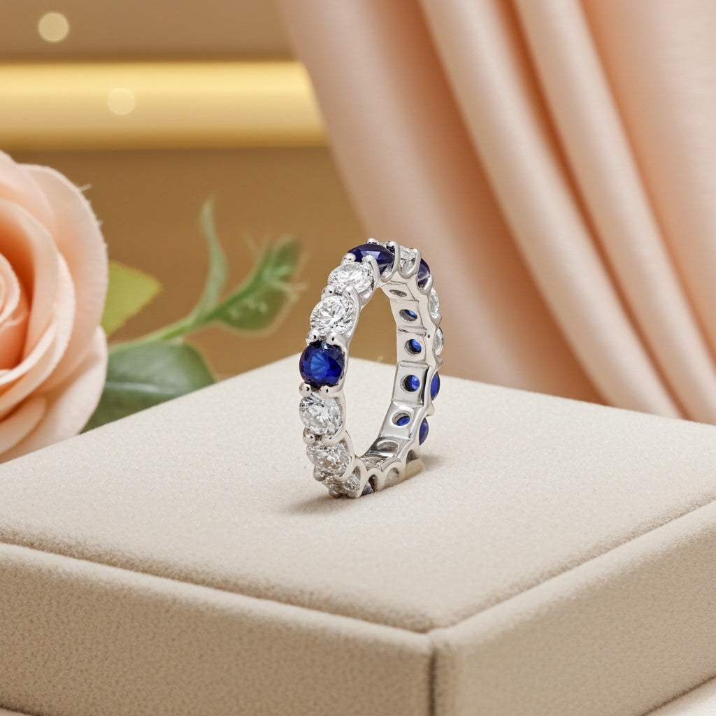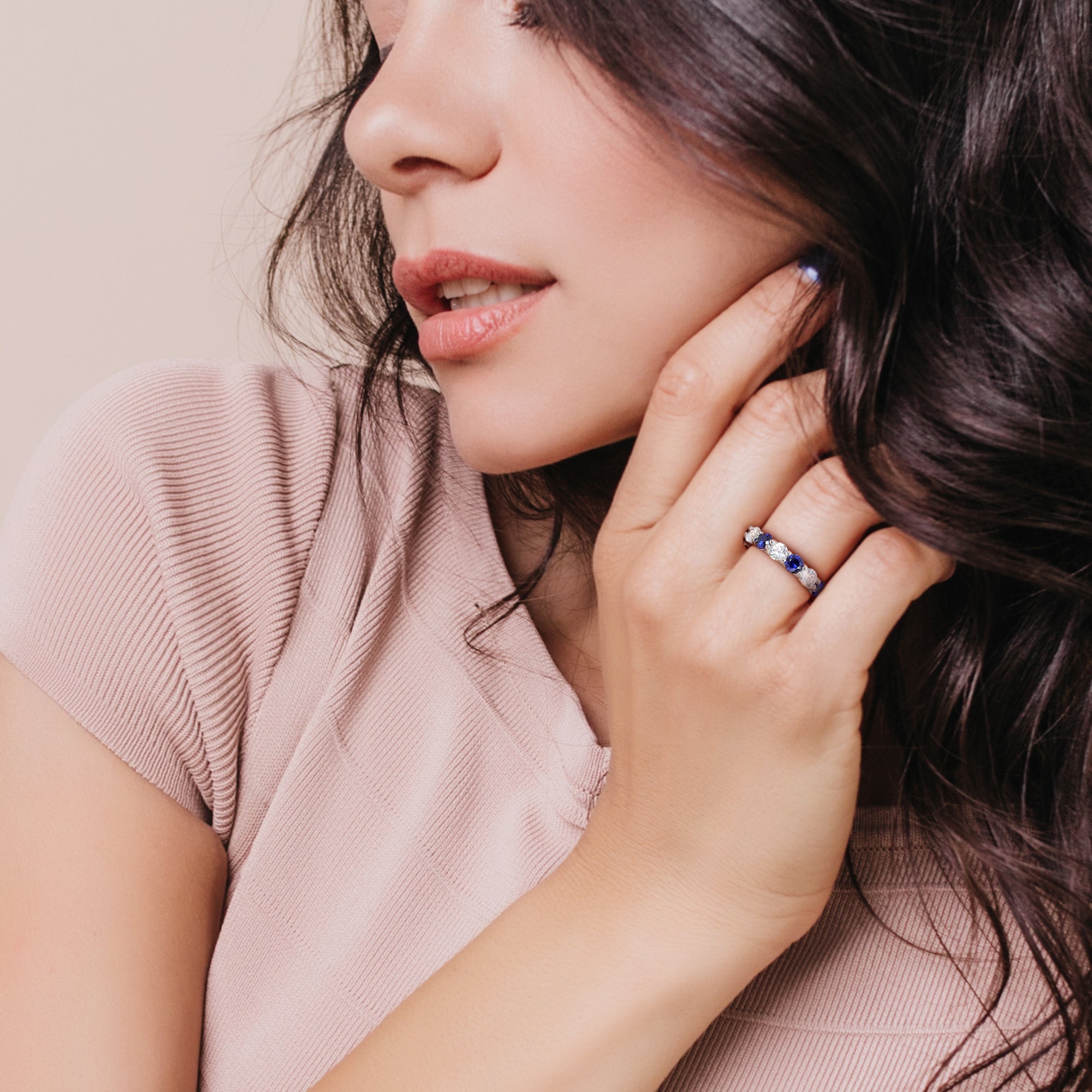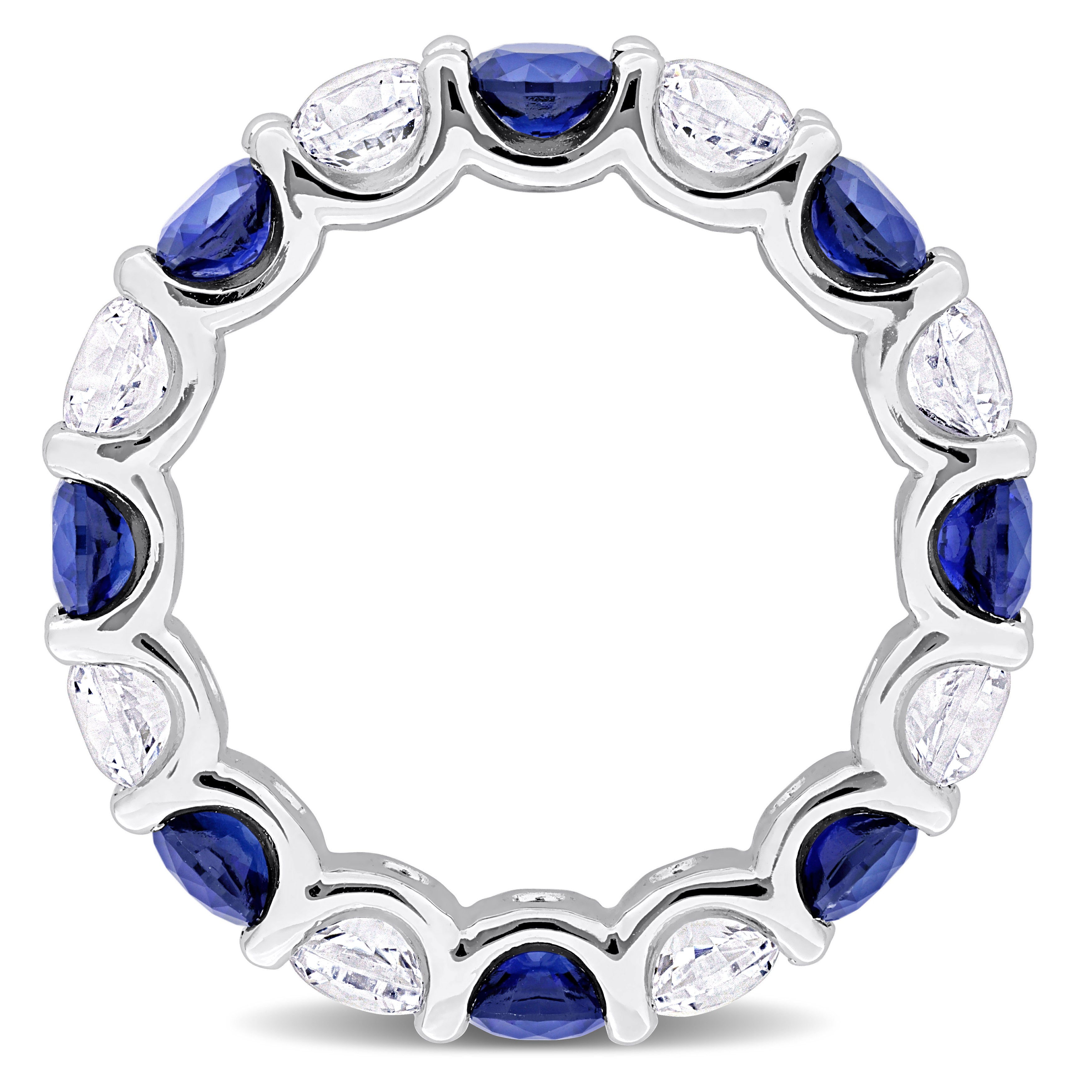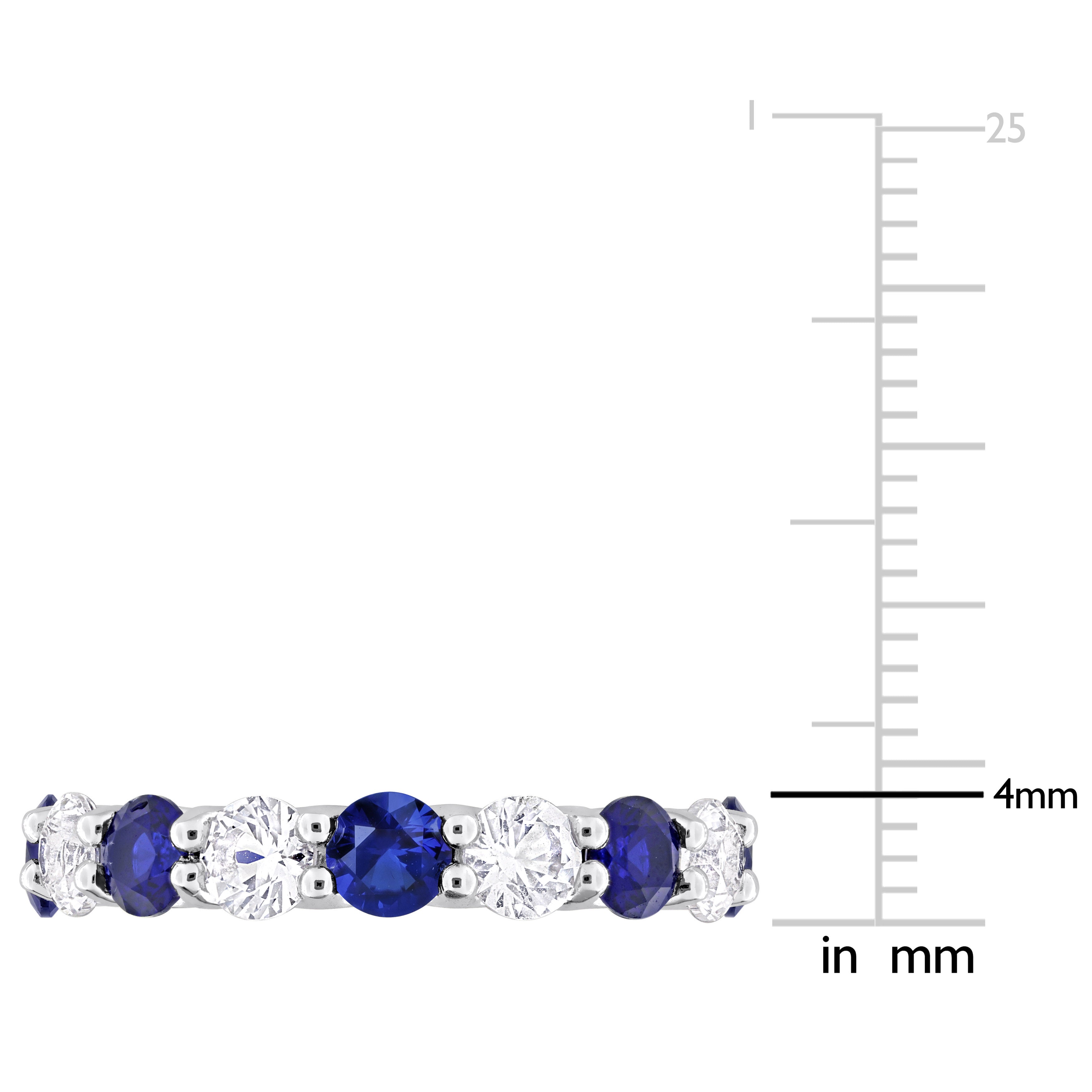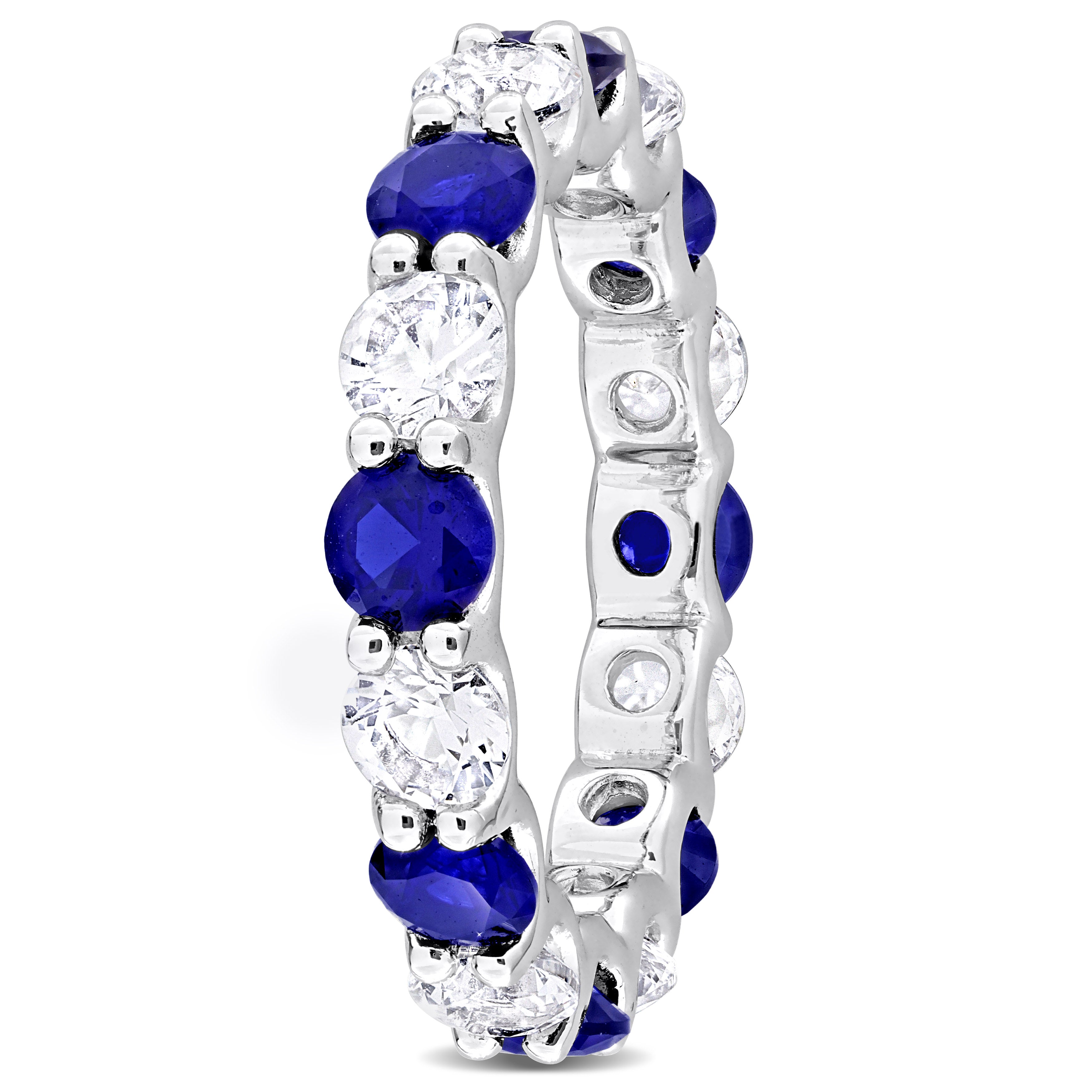 Express everlasting elegance with this Eternity Band Ring. Set in sterling silver, this stunning band features alternating lab-created sapphire gemstones and lab-created white sapphires, symbolizing an unending circle of love and commitment. Perfect for any occasion, this eternity band offers a timeless design and vibrant sparkle, making it a cherished addition to your jewelry collection.