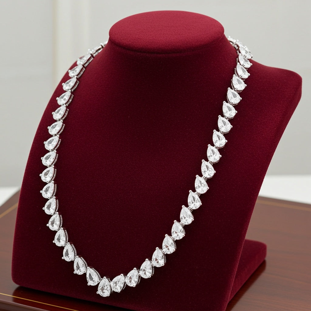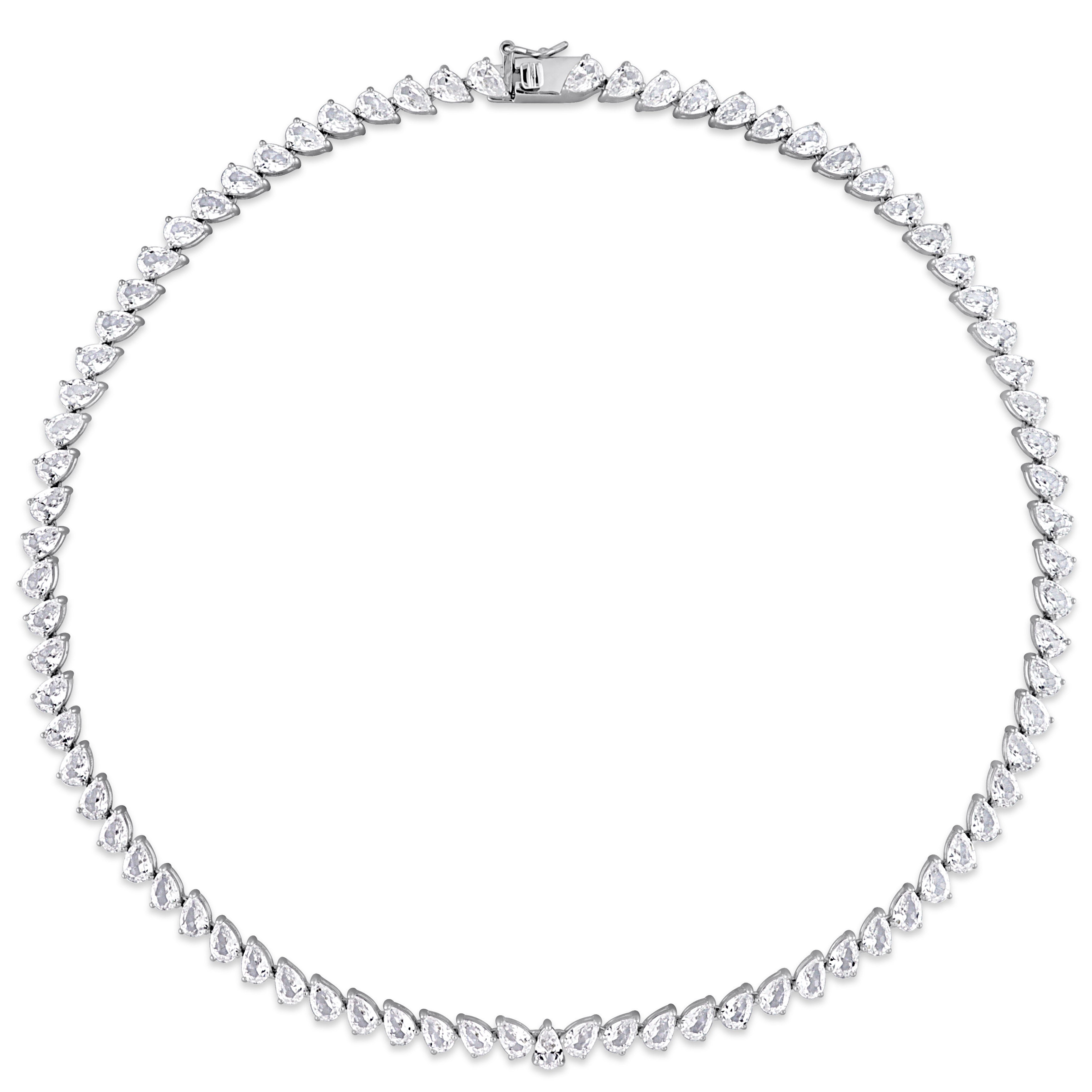 Make her feel like a princess with this magnificent Tennis Necklace. Mounted in shimmering sterling silver, this exquisite necklace features pear-cut created white sapphire gemstones. Polished to a brilliant shine, this splendid necklace is secured with tongue and groove clasp. Coordinate this glamorous necklace with a pair of teardrop earrings for a complete look.