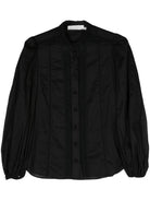 BLACK COTTON LACE TRIM BAND COLLAR FRONT BUTTON FASTENING LONG PUFF SLEEVES ELASTICATED CUFFS CURVED HEM