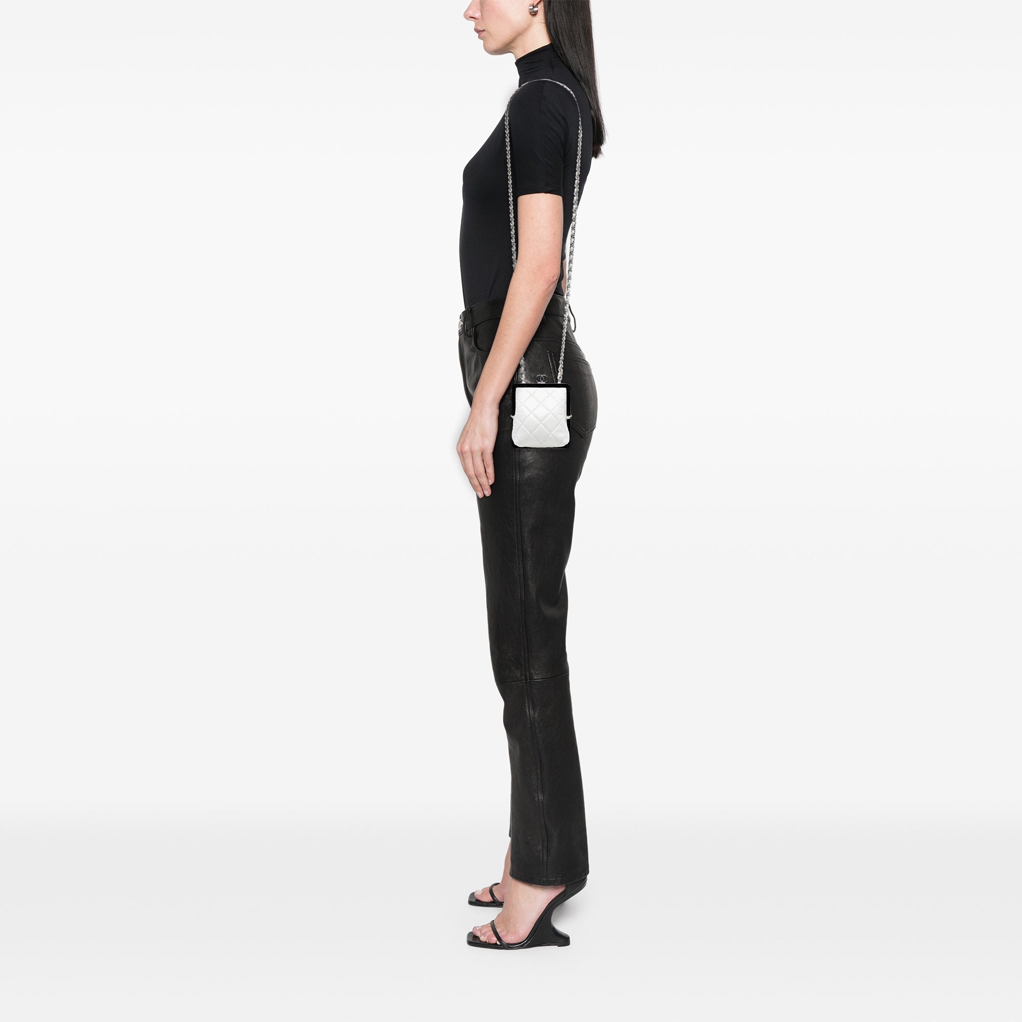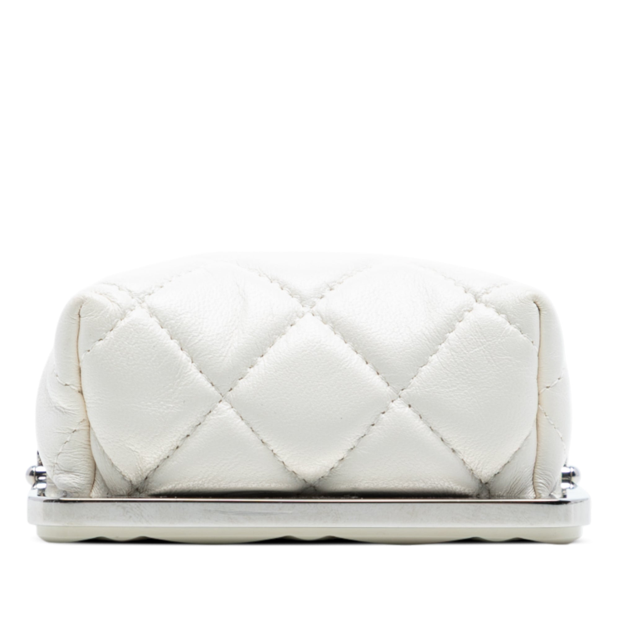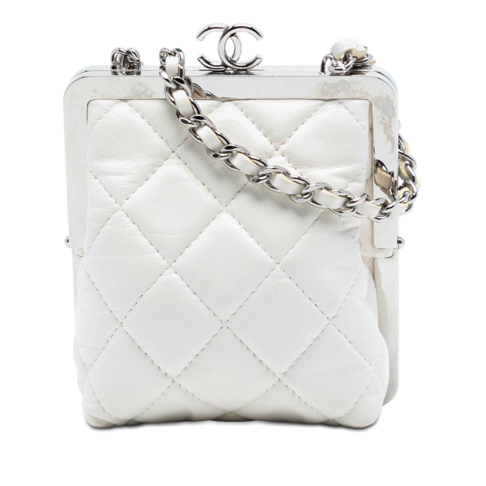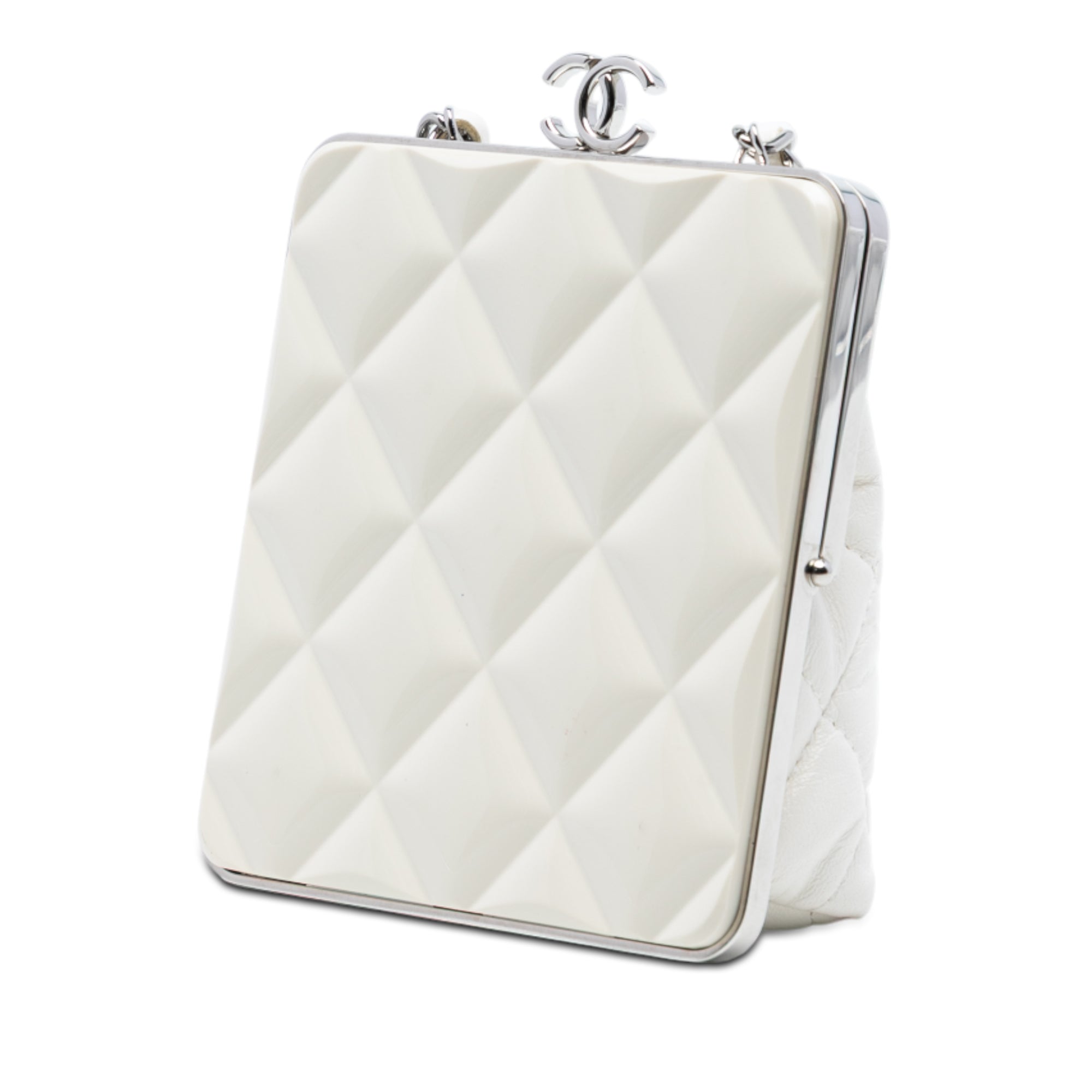 This crossbody bag features a plexiglass and lambskin body, a leather woven chain shoulder strap, and a metal frame with kiss lock closure.