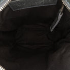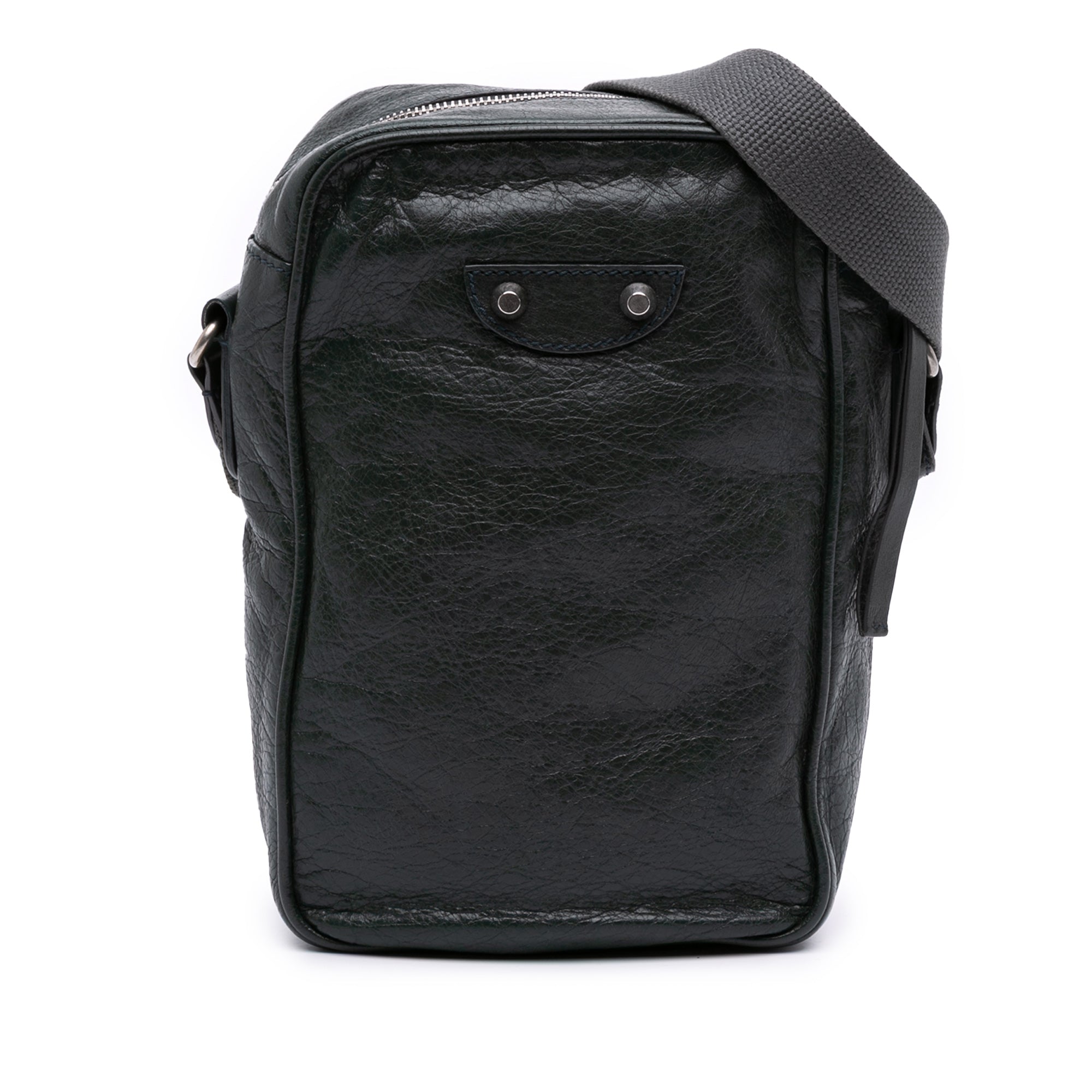 The Classic Reporter features a lambskin leather body with silver-tone studs, a flat strap, a top zip closure, an exterior back open pocket, and an interior zip pocket.