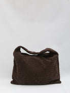 Large Hop bag in “Fondant” brown suede leather with an all-over intrecciato pattern. Features a fixed top handle, magnetic flap closure, a spacious main interior compartment, and an internal zip pocket. Dust bag included.