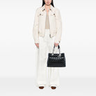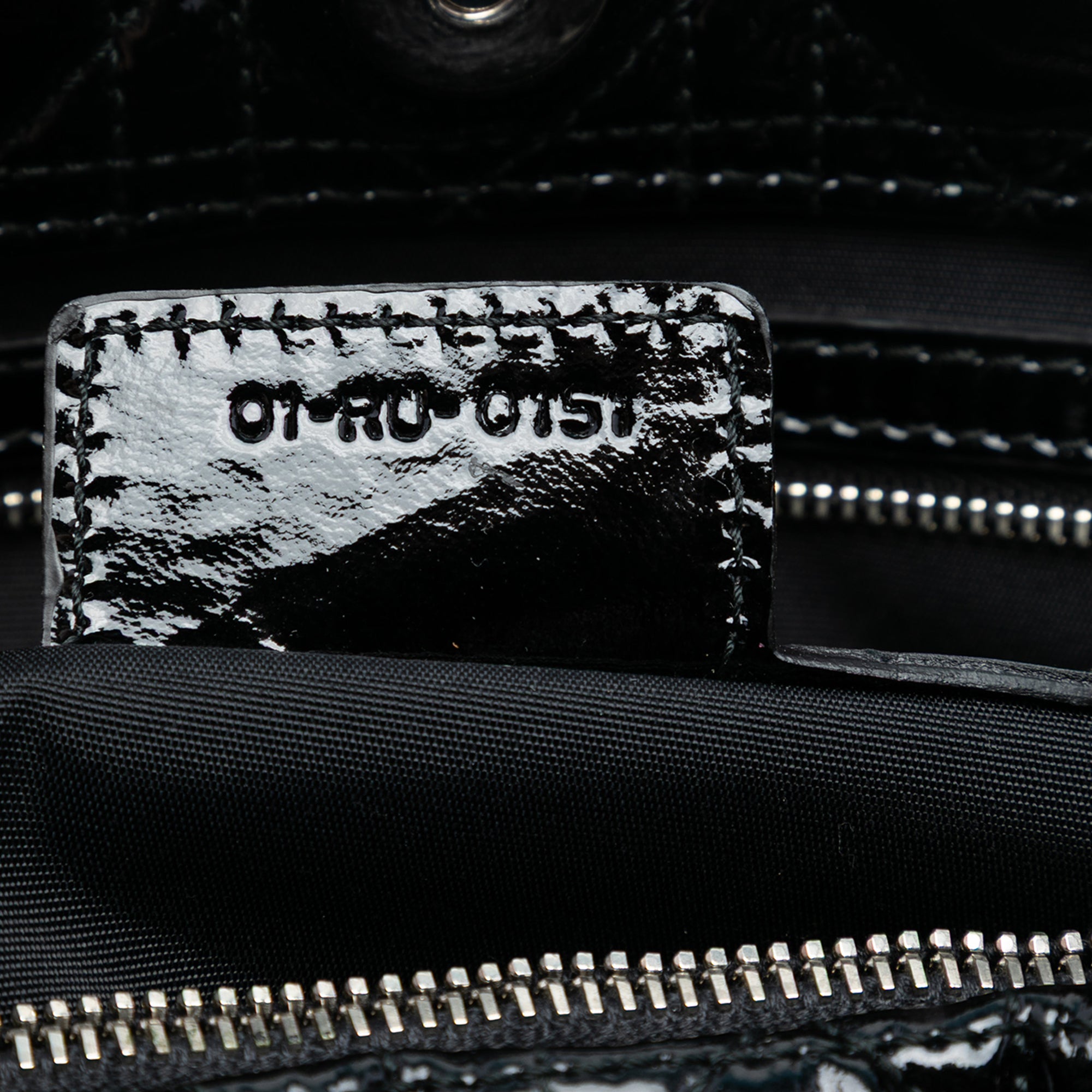 This tote features a quilted patent leather body, flat leather and chain link handles, an open top with magnetic snap closure, and interior zip and slip pockets.