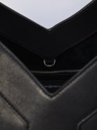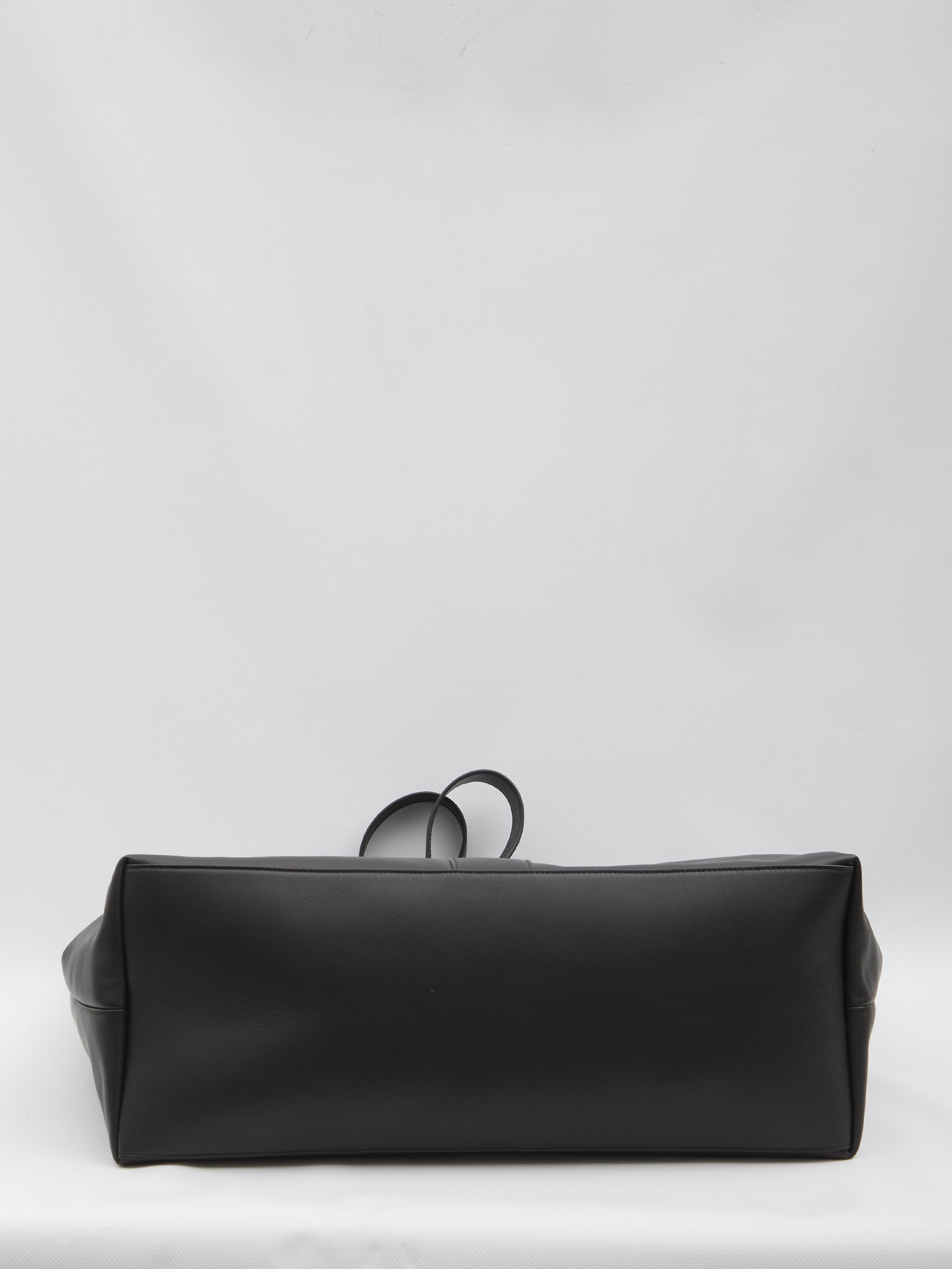Tote bag in finely grained black leather. Features fixed handles, hook closure, single compartment with zip pocket, and metal hardware. Dust bag included. Any irregularities in the leather are not to be considered defects, but rather a characteristic of the material.