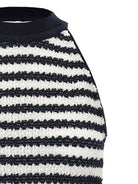 Elevate your warm-weather wardrobe with the 'Laura Owens' sleeveless top by Antonino Valenti. This sophisticated piece features a striking navy and white striped pattern in a unique wrinkle fabric that adds texture and visual interest to any ensemble.