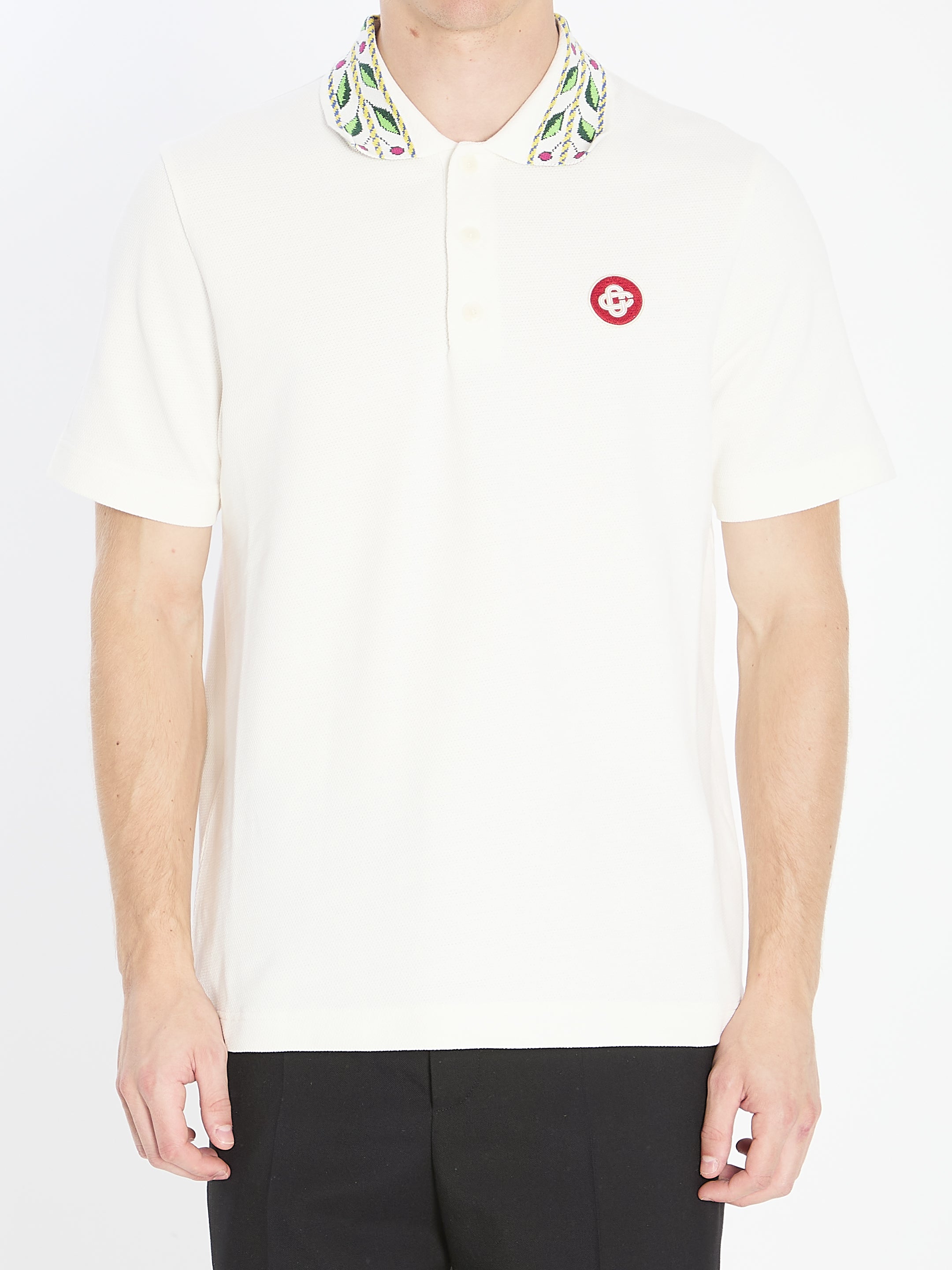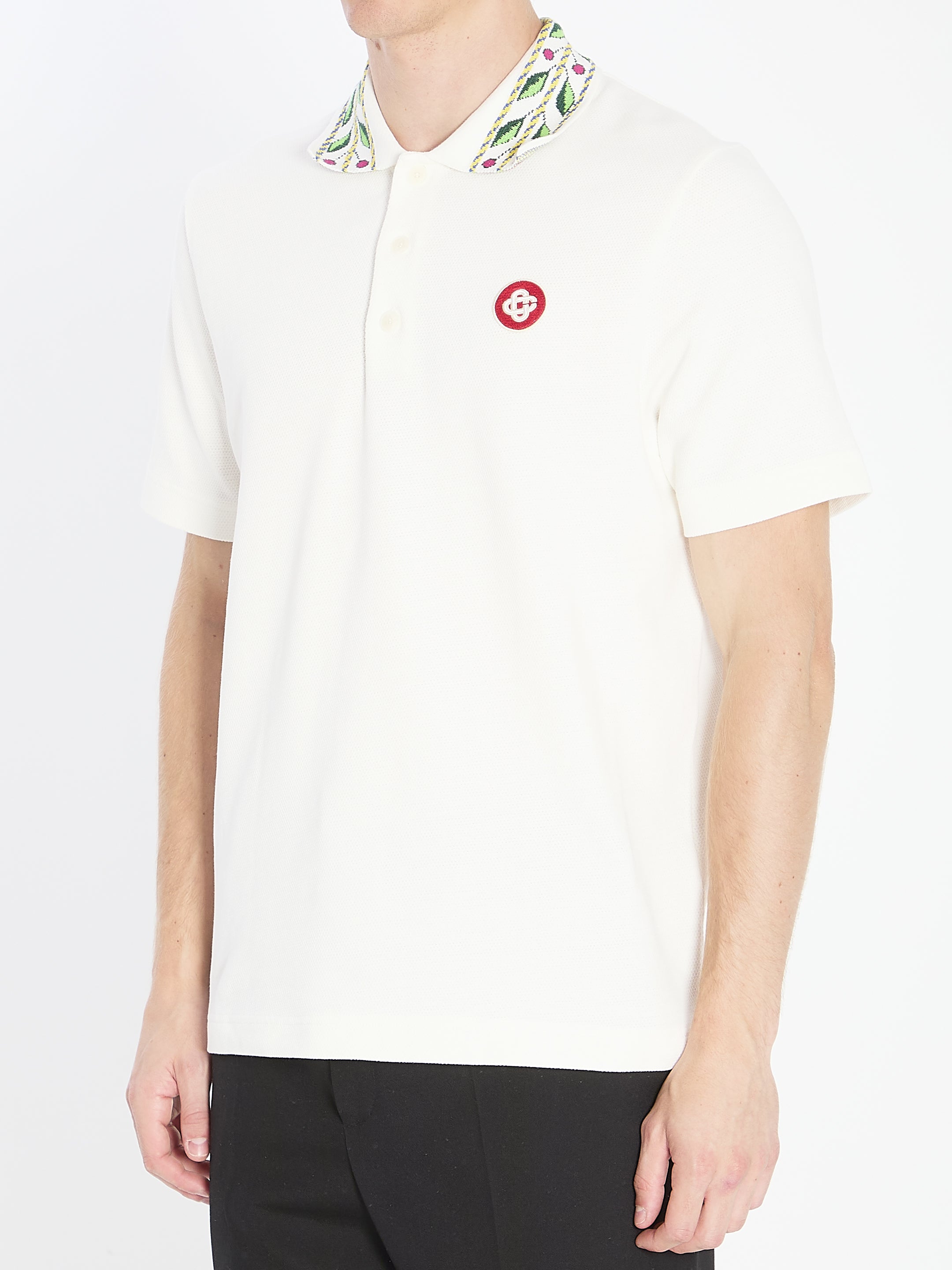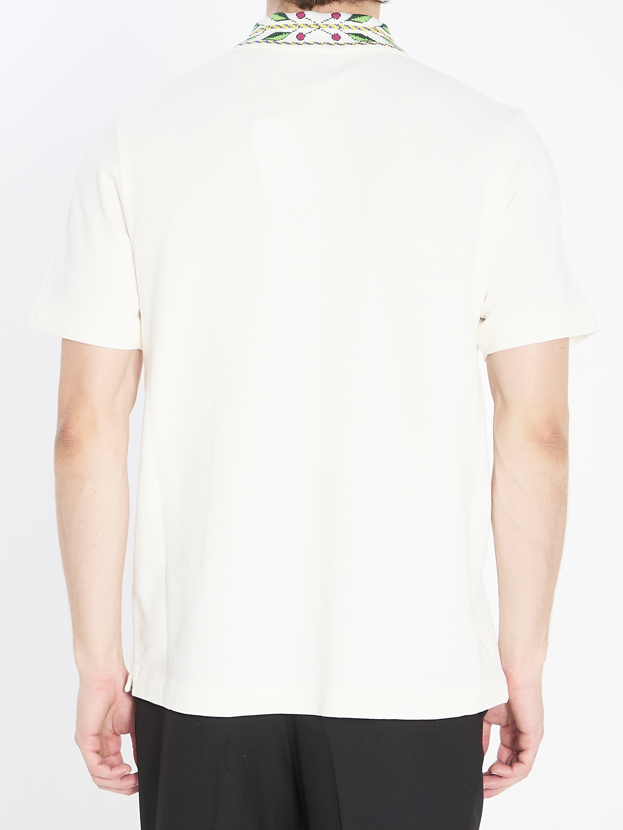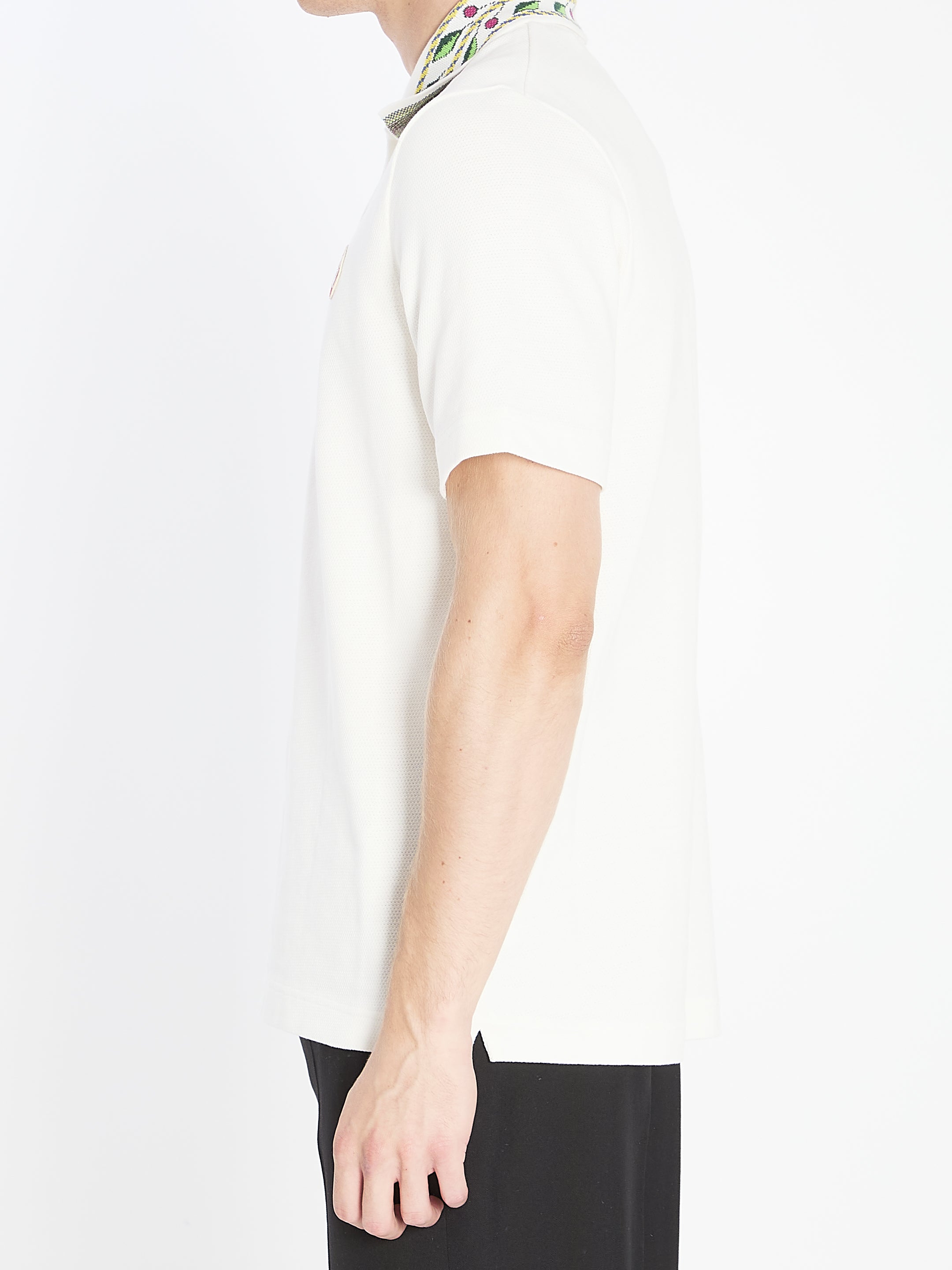 WHITE COTTON PIQUé POLO SHIRT. FEATURING A POLO COLLAR WITH THREE BUTTONS, EMBROIDERED DESIGN ON THE COLLAR, SHORT SLEEVES, LOGO APPLIQUé ON THE CHEST, AND SMALL SIDE SLITS AT THE HEM. REGULAR FIT.