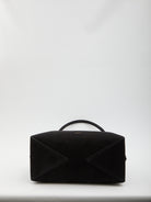 Soft sueded effect calfskin nappa bowling bag. It features a diagonal tubular handle with decorative ties, an Alaia signature on the front, double slider zip closure, one main compartment, two internal flat pockets, and one removable mirror. Dust bag included. Any leather imperfections should not be considered manufacturing defects, but a characteristic of the material.