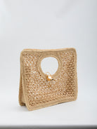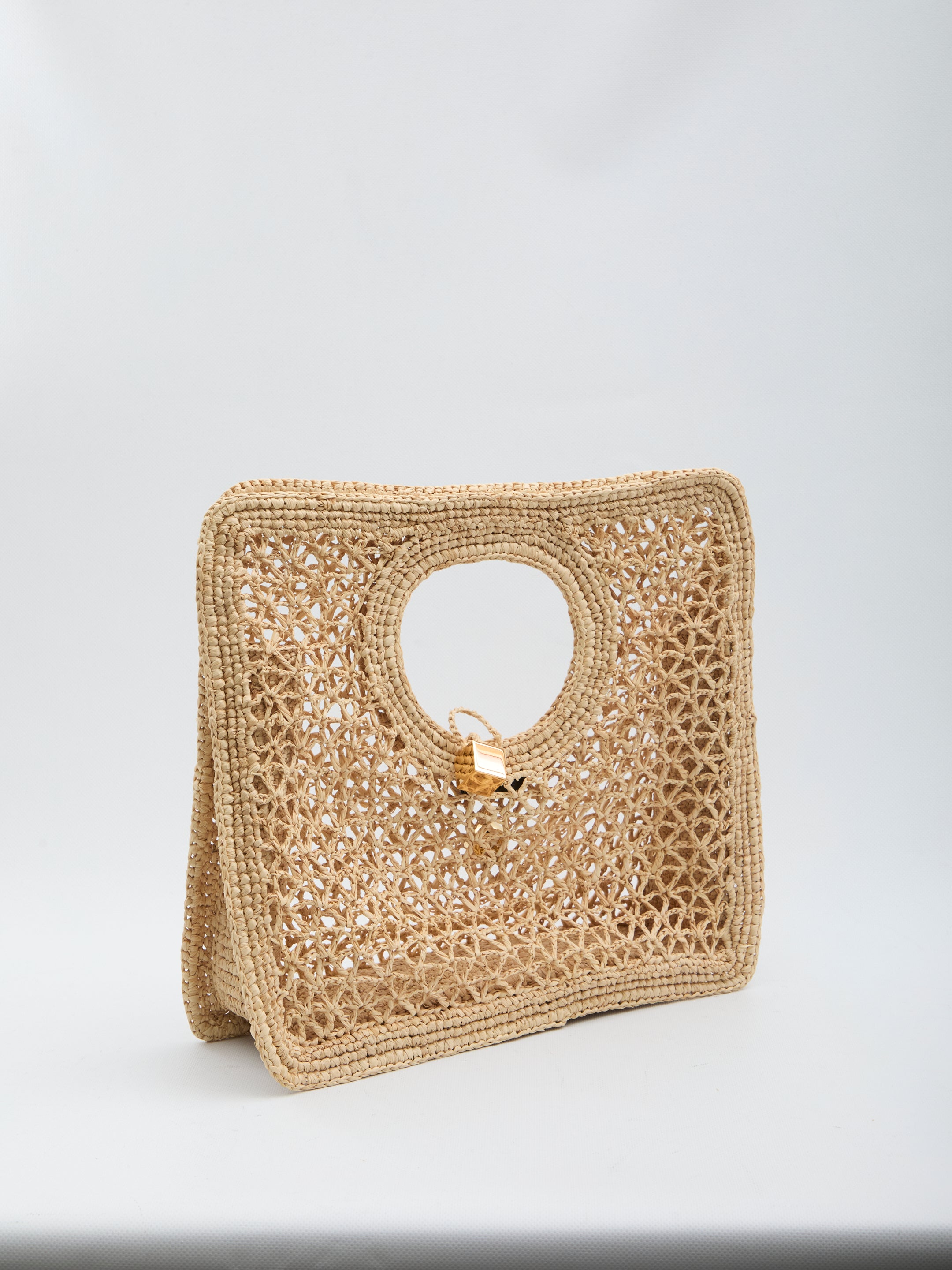 This exquisite handbag features a beautifully woven raffia construction in a chic beige tone, complemented by a distinctive circular top handle that doubles as an architectural detail. The gold-tone pendant and interlocking closure add a touch of luxury to this perfectly square silhouette.