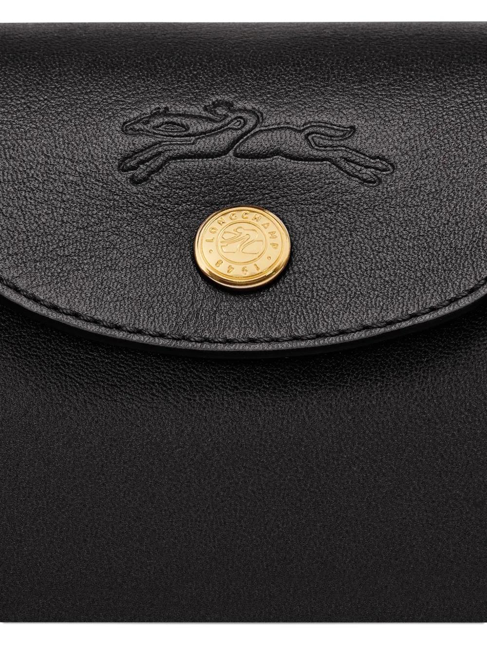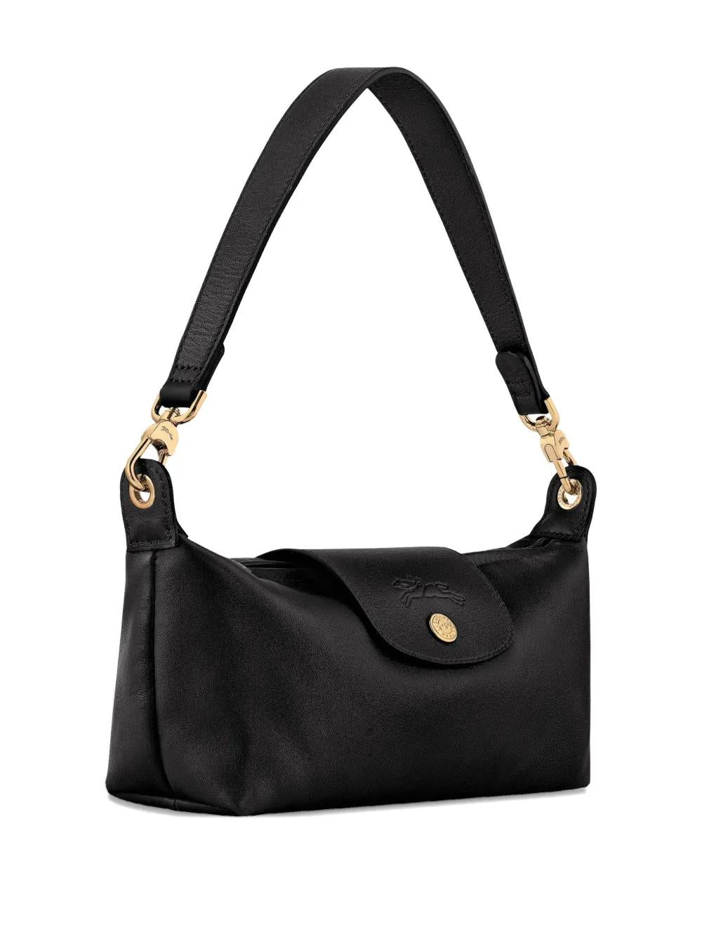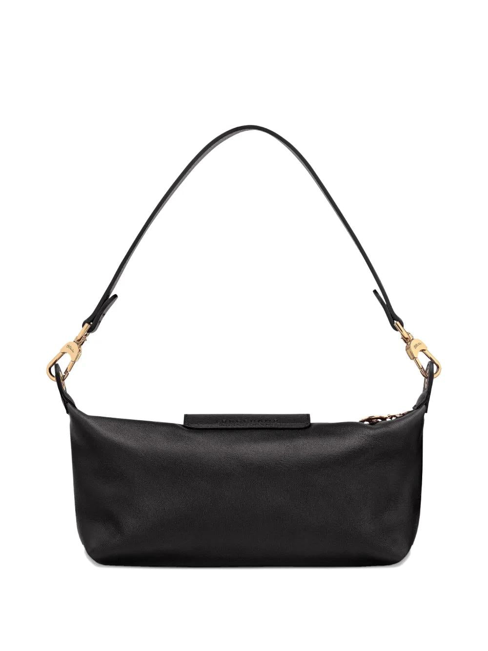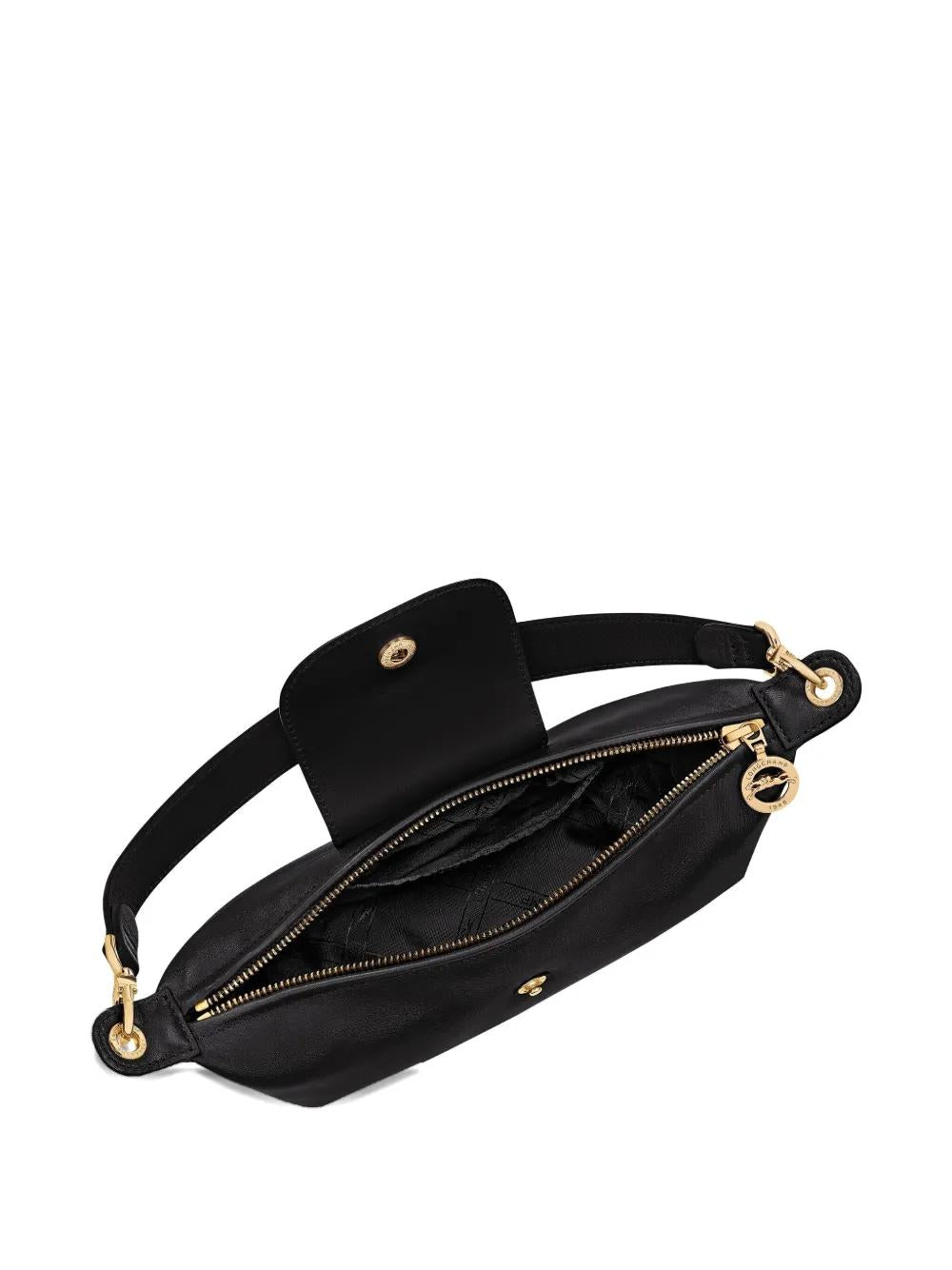 Crafted from supple calf leather in classic black, this compact shoulder bag features gold-tone hardware and a secure top zip fastening with an elegant flap closure. The adjustable shoulder strap ensures comfortable wear, while the iconic Longchamp logo detail adds a touch of refined branding.
