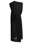 Jacquemus "Le robe drap" midi dress, constructed of textured sheer cotton poplin, features a column silhouette with a fitted, asymmetrical cut. The crew neck accompanies a sleeveless structure, characterized by asymmetrical shoulders. The waist takes on a draped shape, while the length reaches mid-calf. An invisible side zipper completes the garment's construction.