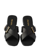 Elevate your warm-weather wardrobe with these sophisticated Prada Leather Crisscross Slides. Crafted from luxurious calf leather, these slides feature an elegant crisscross design with a refined buckle detail that adds a touch of hardware sophistication. The low 1 cm heel provides all-day comfort while maintaining a sleek silhouette.