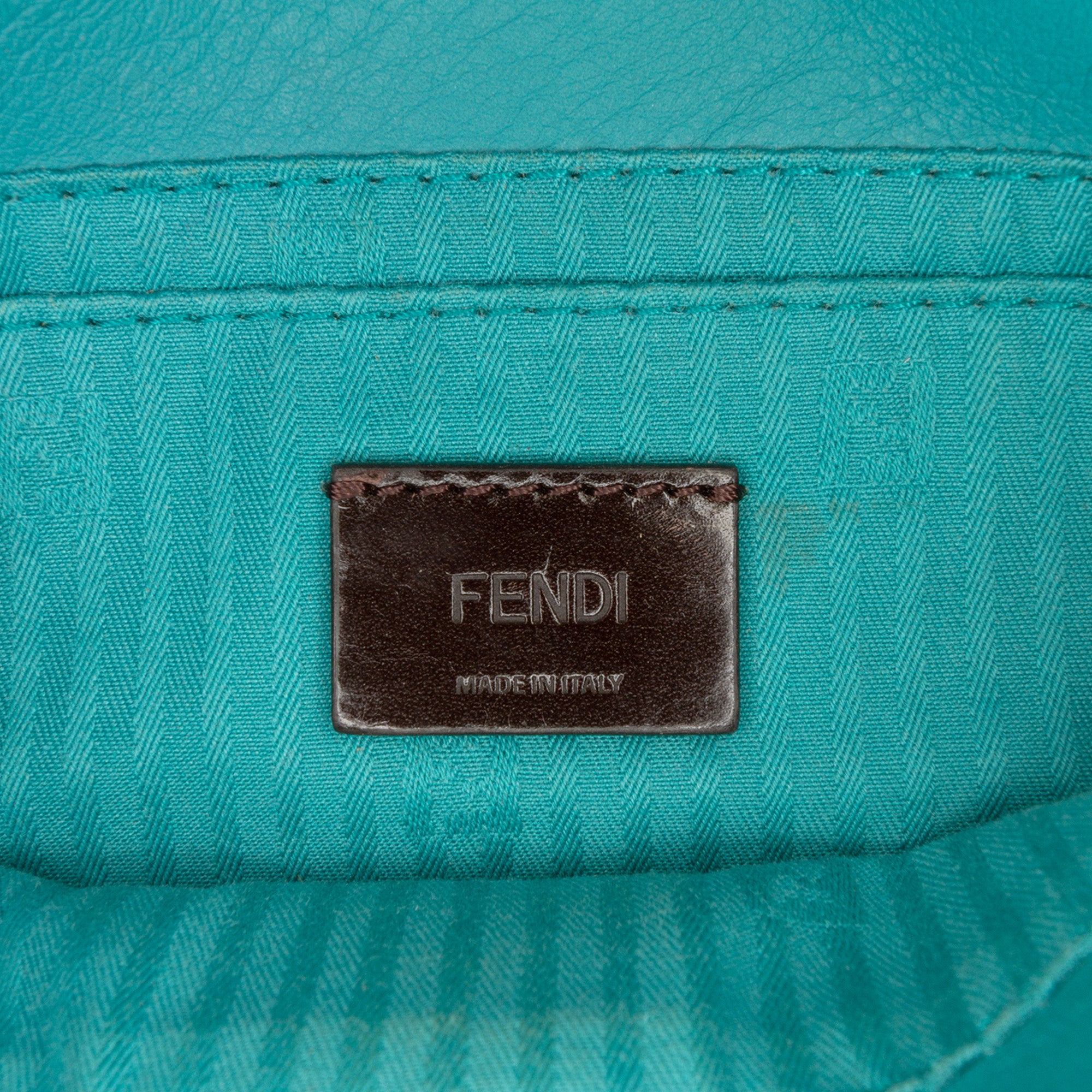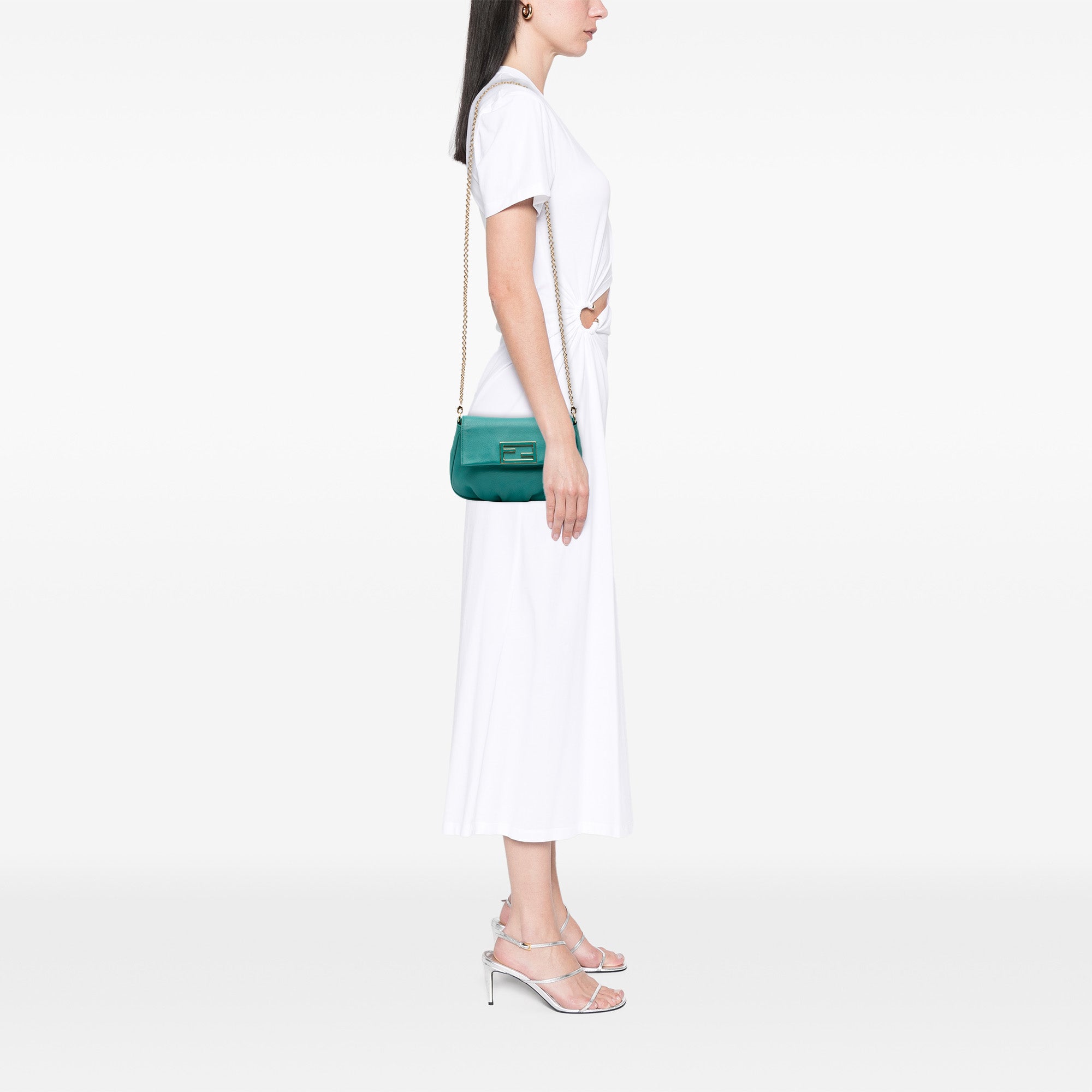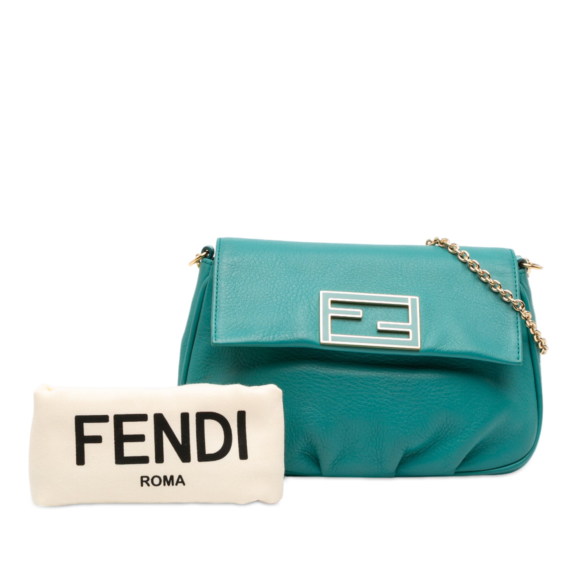 The Fendista features a leather body, a chain link strap, a front flap with magnetic snap closure, and an interior slip pocket.