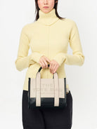 BEIGE/BLACK LEATHER TWO TOP HANDLES ADJUSTABLE DETACHABLE SHOULDER STRAP SILVER-TONE HARDWARE