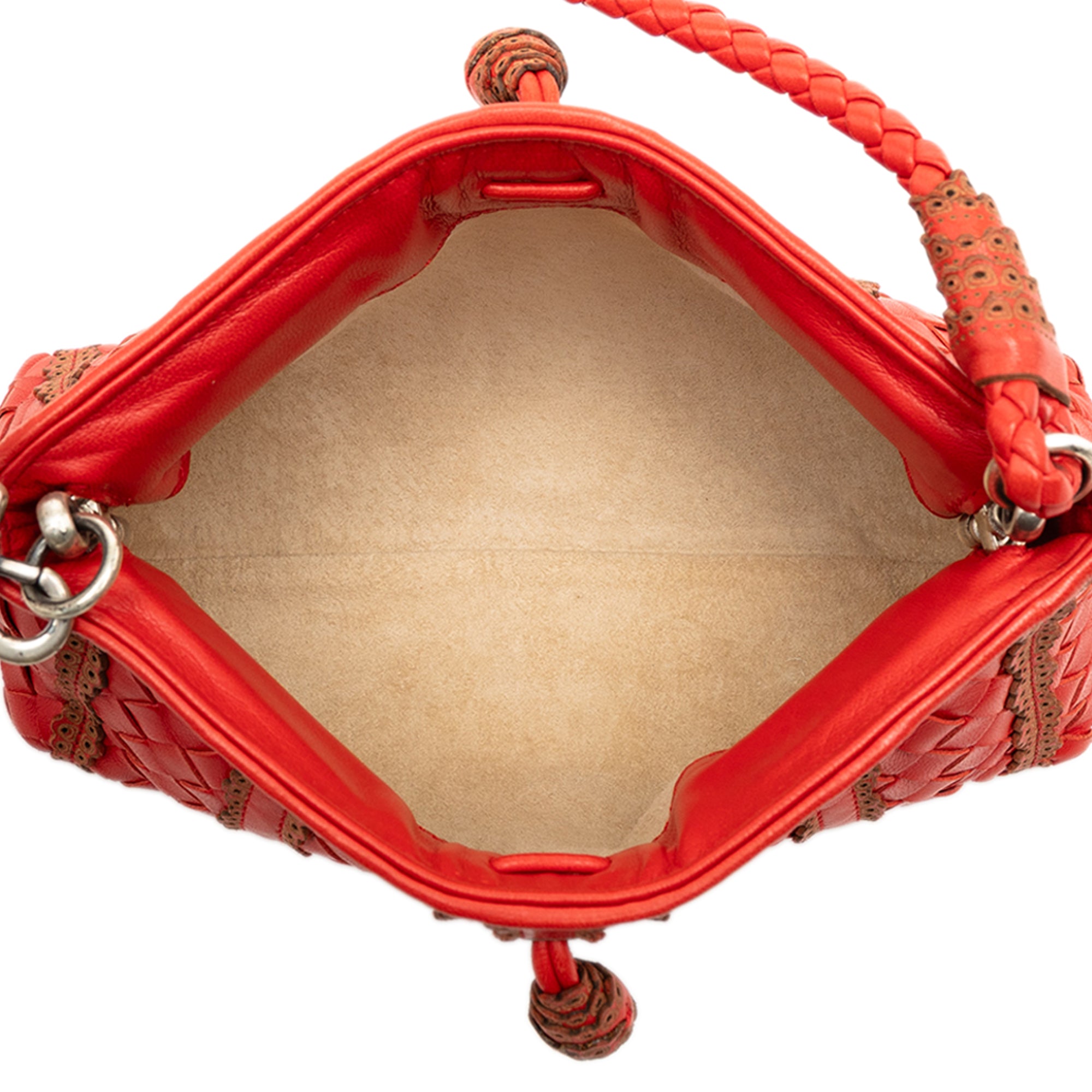 This shoulder bag features a woven leather body, braided rolled strap, and an open top with leather pull tab closure.