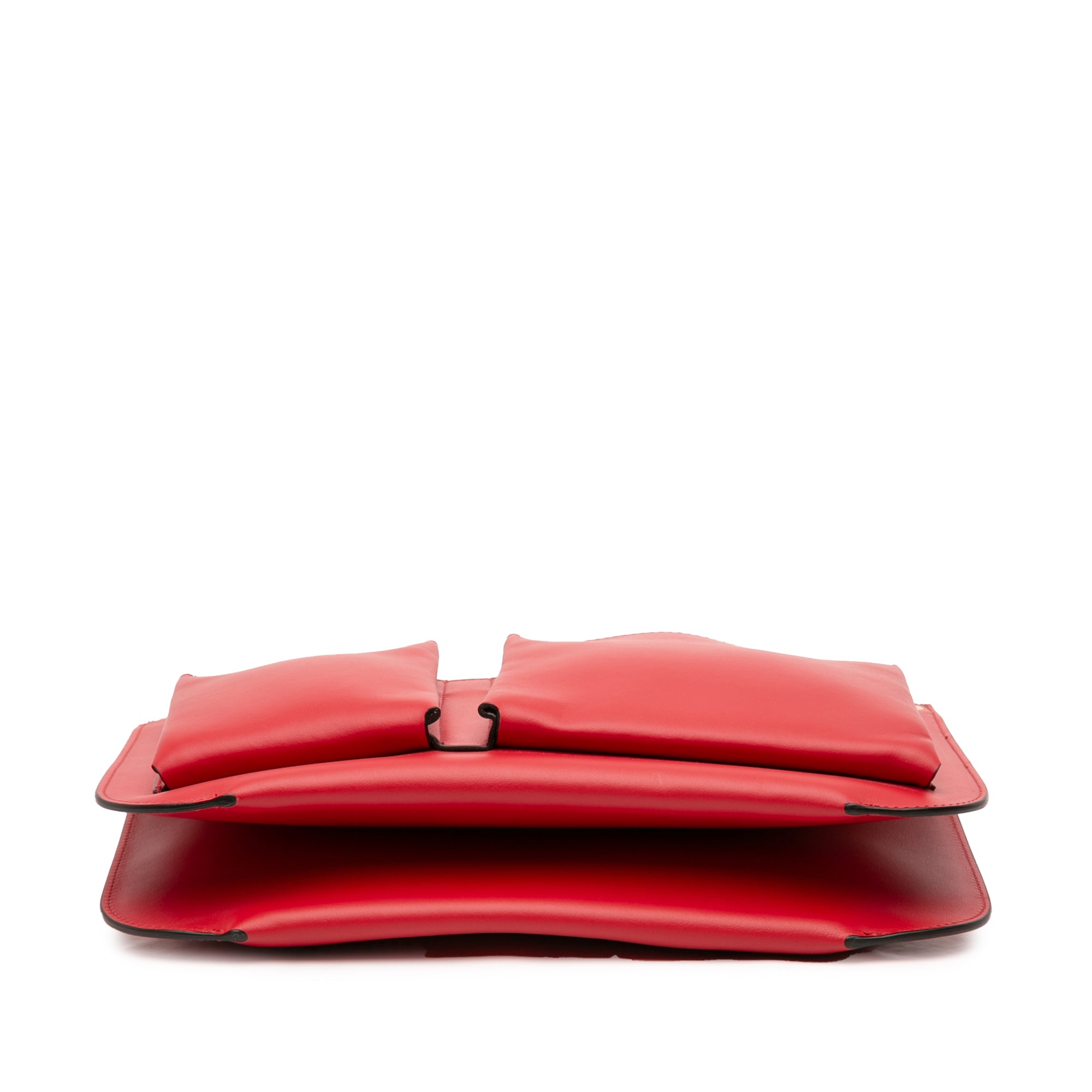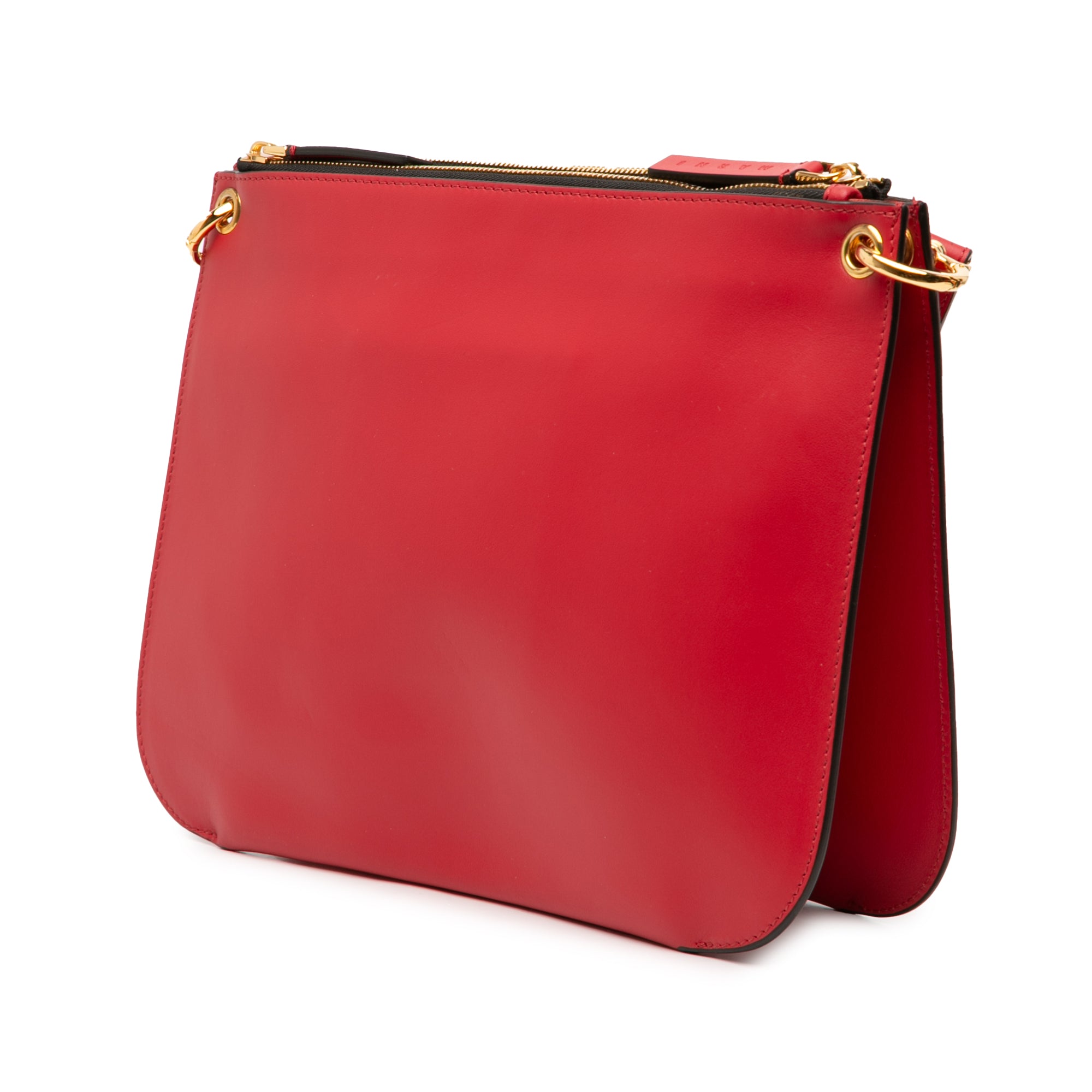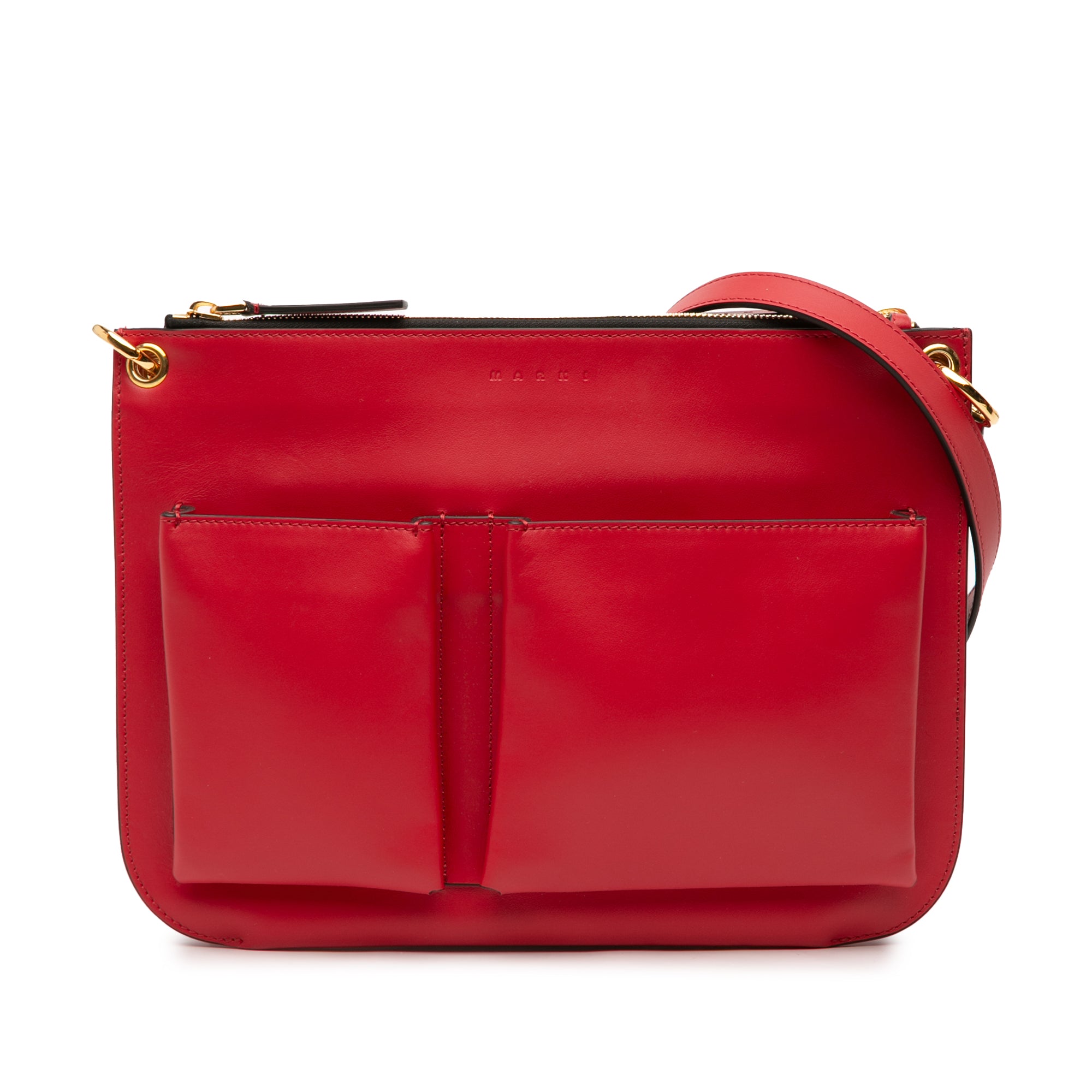 This crossbody features a leather body, a flat leather strap, dual zip compartments, exterior front slip pockets, and interior slip pockets.