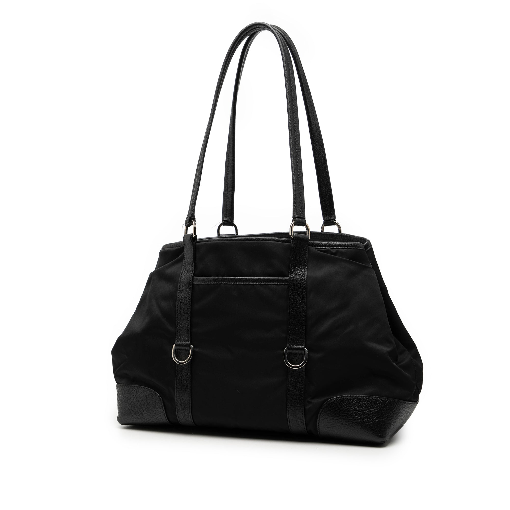 This tote features a nylon body with leather trim, flat leather straps, an open top, exterior slip pockets, and an interior zip pocket.