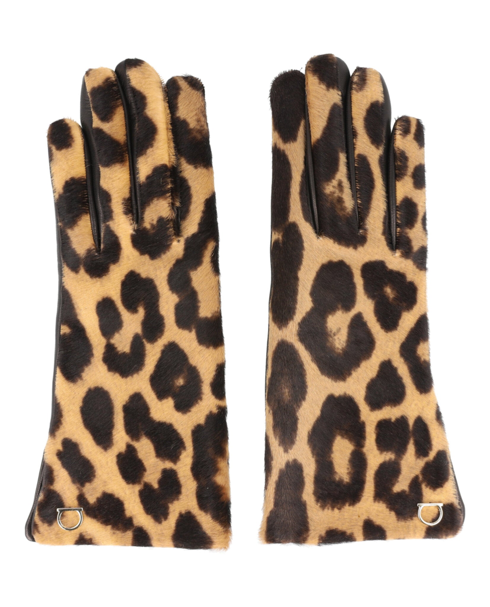 Elevate your cold-weather accessories with these exquisite Ferragamo Leopard Print Pony Hair Leather Gloves. Crafted from luxurious 100% leather with a striking leopard print pony hair front and smooth leather back, these gloves are the perfect blend of sophistication and wild elegance.