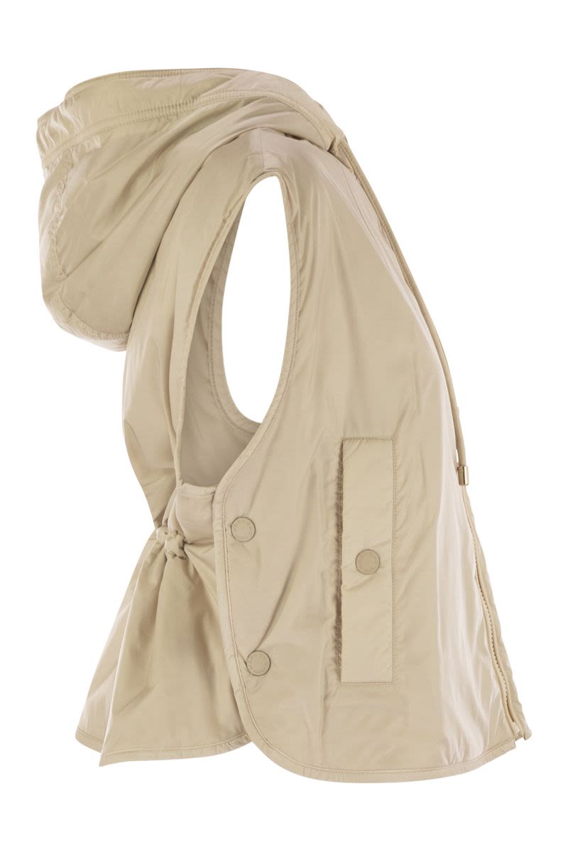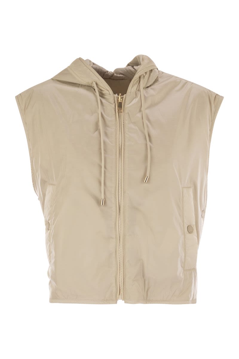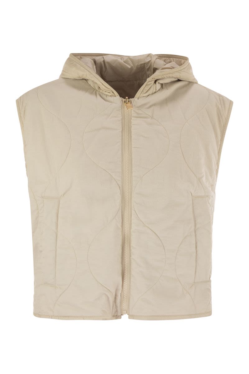 SHORT ONION-QUILTED CANVAS WAISTCOAT WITH DRAWSTRING HOOD, PADDED WITH LUXEPAD ULTRA FINE INSULATING TECHNOLOGY CAMEL-SILK BLEND EDITION. - STRAIGHT LINE WITH ADJUSTABLE INNER DRAWSTRING WAISTBAND - ZIPPED FRONT CLOSURE - SLASH POCKETS ON BOTH SIDES - SIDE SLITS THAT CAN BE OPENED WITH SNAP BUTTONS - WEEKEND MAX MARA LOGO PRINTED ON THE INSIDE LINING OF THE SPUR DESIGNER ID: 2525296021600 004