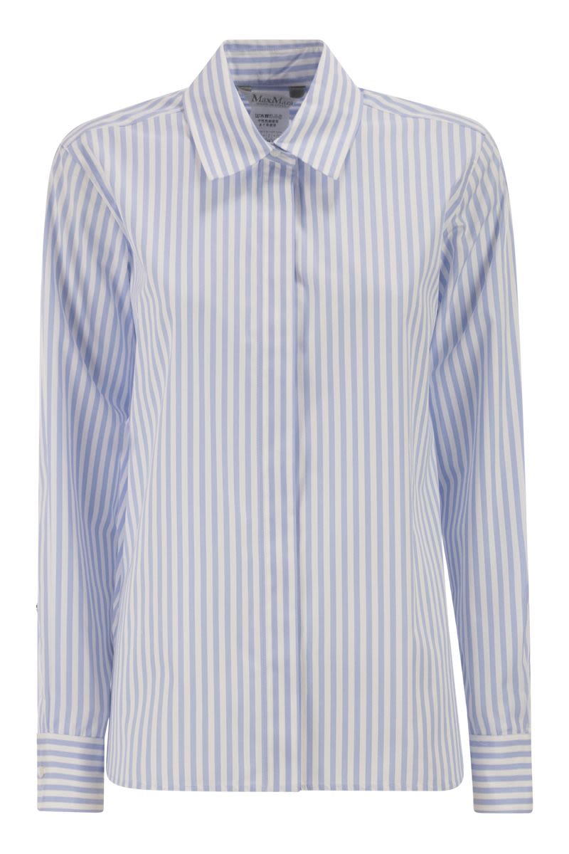 MAX MARA ACCENNI STRIPED LIGHT BLUE COTTON SHIRT. CRAFTED FROM STRIPED LIGHT BLUE AND WHITE COTTON POPLIN, POINTED COLLAR, FRONT CONCEALING BUTTONED FASTENING, LONG SLEEVES, BUTTONED CUFFS, SIDE METAL M DETAIL, BACK YOKE AND BOXY PLEAT, ROUND HEM. REGULAR FIT.